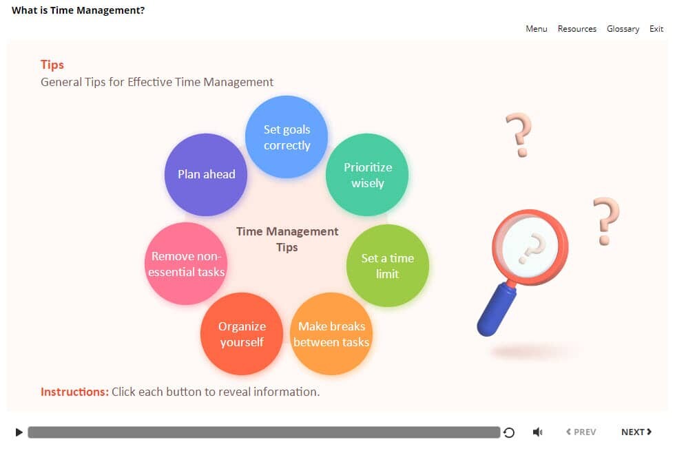 Time Management Tips — Storyline Template. The unique eLearning interaction is designed with Articulate Storyline 360 software. The template contains seven clickable objects designed as colorful circles. The user must click on each of them to reveal the additional information in pop-ups. The template is a ready-made product: all you need is to insert it into the projects and fill with own training content. It’s recommended to launch it on the devices with the screen size more than 7 inches.