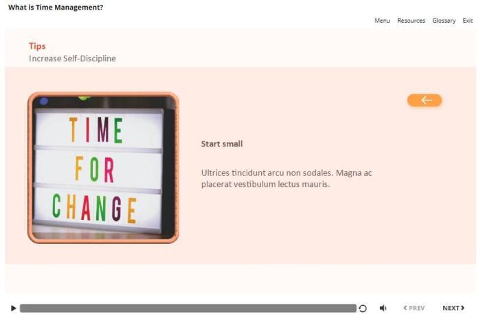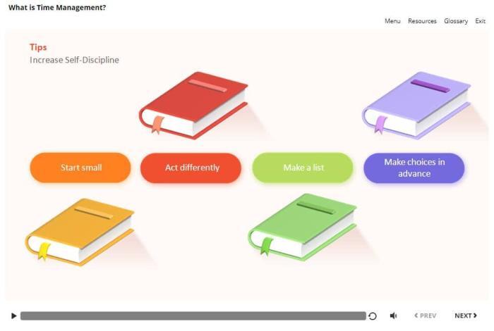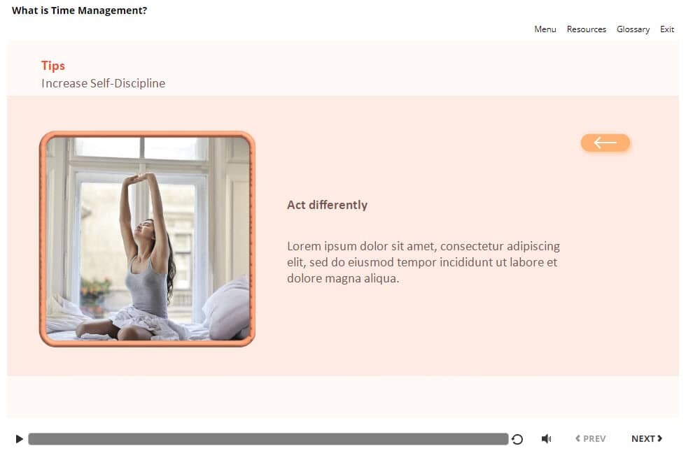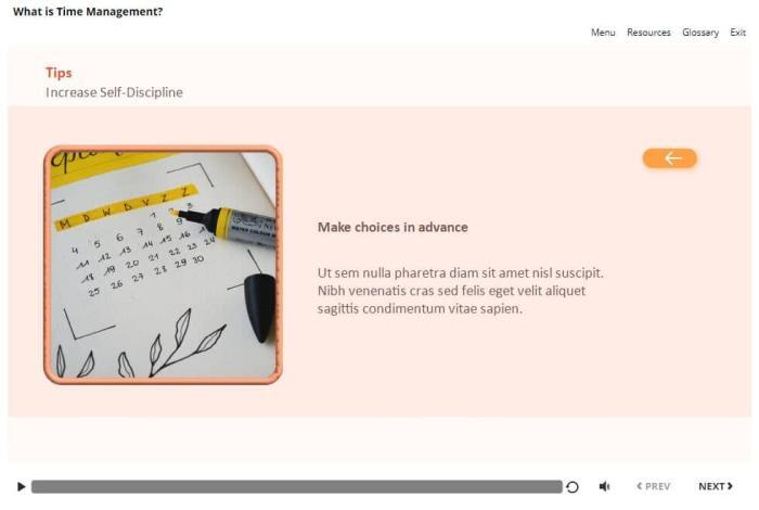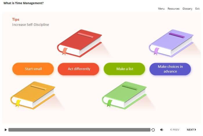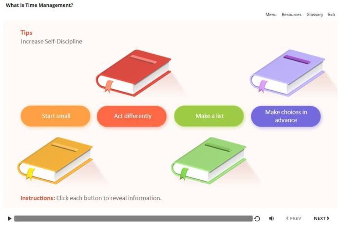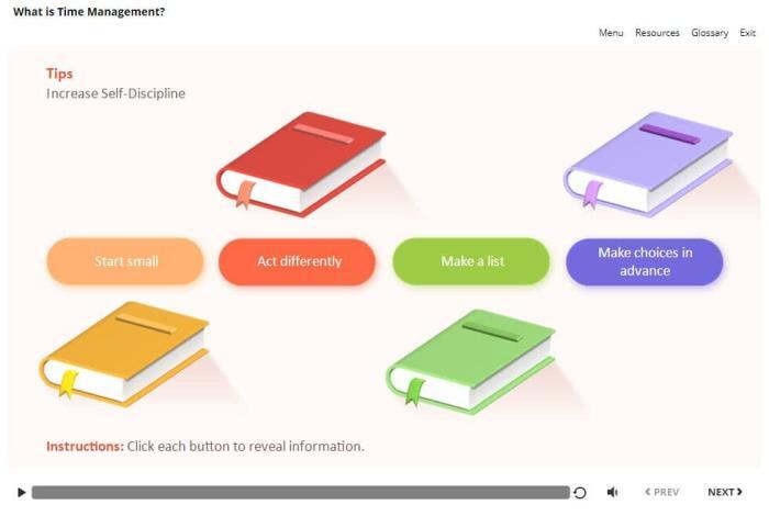 Increase Self-Discipline Tabs — Storyline Template. The unique eLearning interaction is designed with Articulate Storyline 360 software. The template contains four clickable buttons. The user must click on each of them to reveal the additional information. The template is a ready-made product: all you need is to insert it into the projects and fill with own training content. It’s recommended to launch it on the devices with the screen size more than 7 inches.