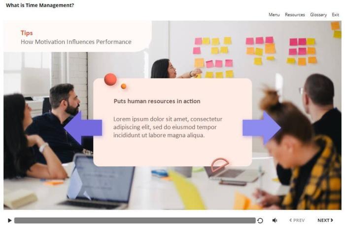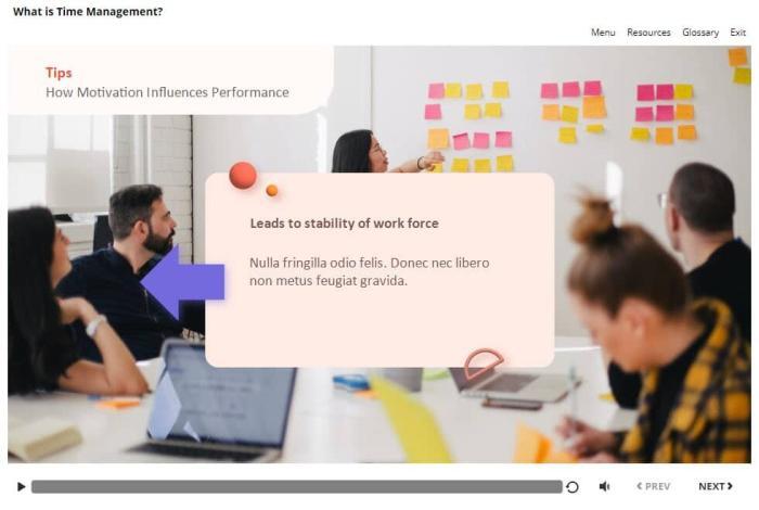 Motivation Influences Performance — Storyline Template. The unique eLearning interaction is designed with Articulate Storyline 360 software. The template represents a classic slideshow that is composed of six slides. The user must click the right and left arrows to reveal the additional information. The template is a ready-made product: all you need is to insert it into the projects and fill with own training content. It’s recommended to launch it on the devices with the screen size more than 7 inches.