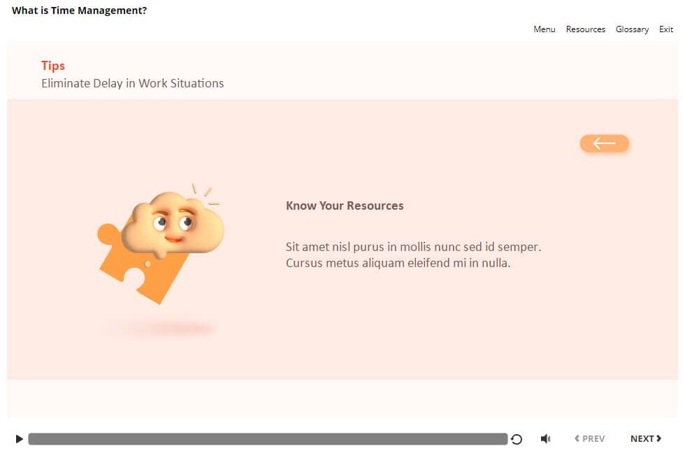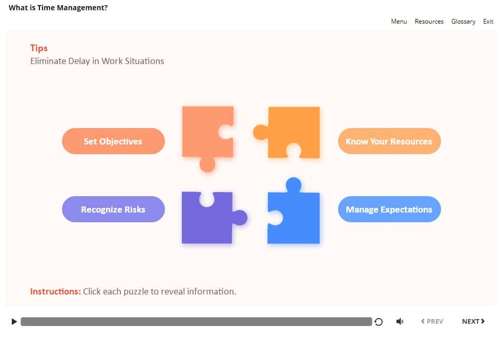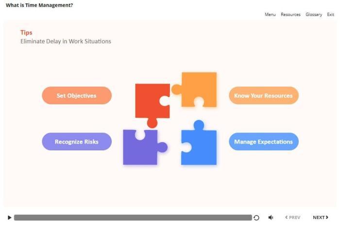 Eliminate Delay in Work Situations — Storyline Template. The unique eLearning interaction is designed with Articulate Storyline 360 software. The template contains four clickable objects designed as jigsaw puzzle pieces. The user must click on each of them to reveal the additional information. The template is a ready-made product: all you need is to insert it into the projects and fill with own training content. It’s recommended to launch it on the devices with the screen size more than 7 inches.