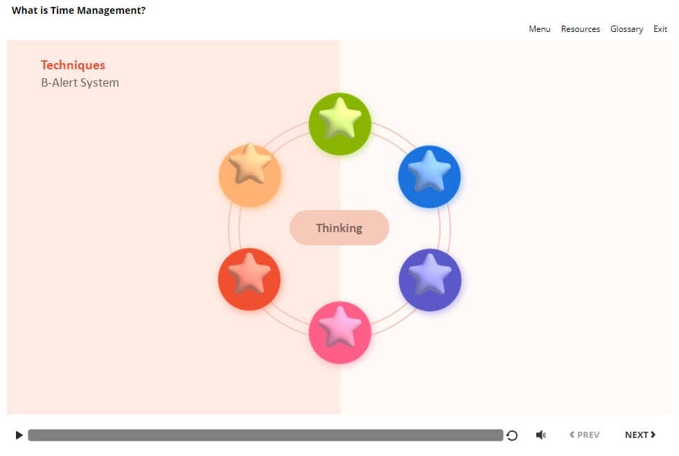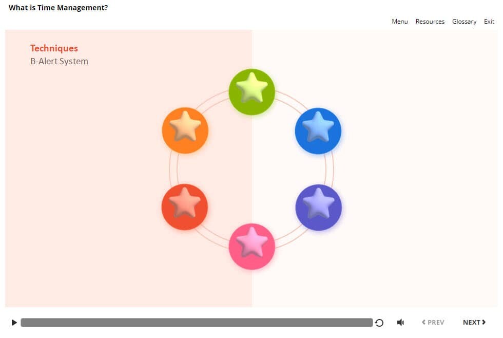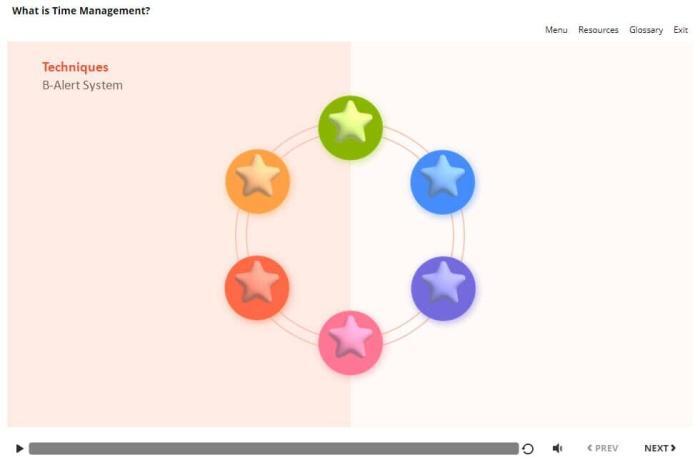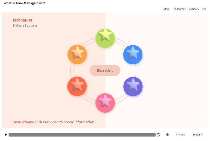 B-Alert System — Storyline Template. The unique eLearning interaction is designed with Articulate Storyline 360 software. The template contains six round buttons with star icons. The user must click on each button to reveal the additional information. The template is a ready-made product: all you need is to insert it into the projects and fill with own training content. It’s recommended to launch it on the devices with the screen size more than 7 inches.