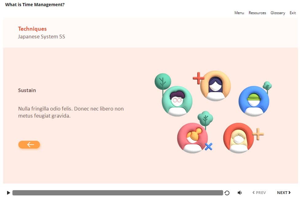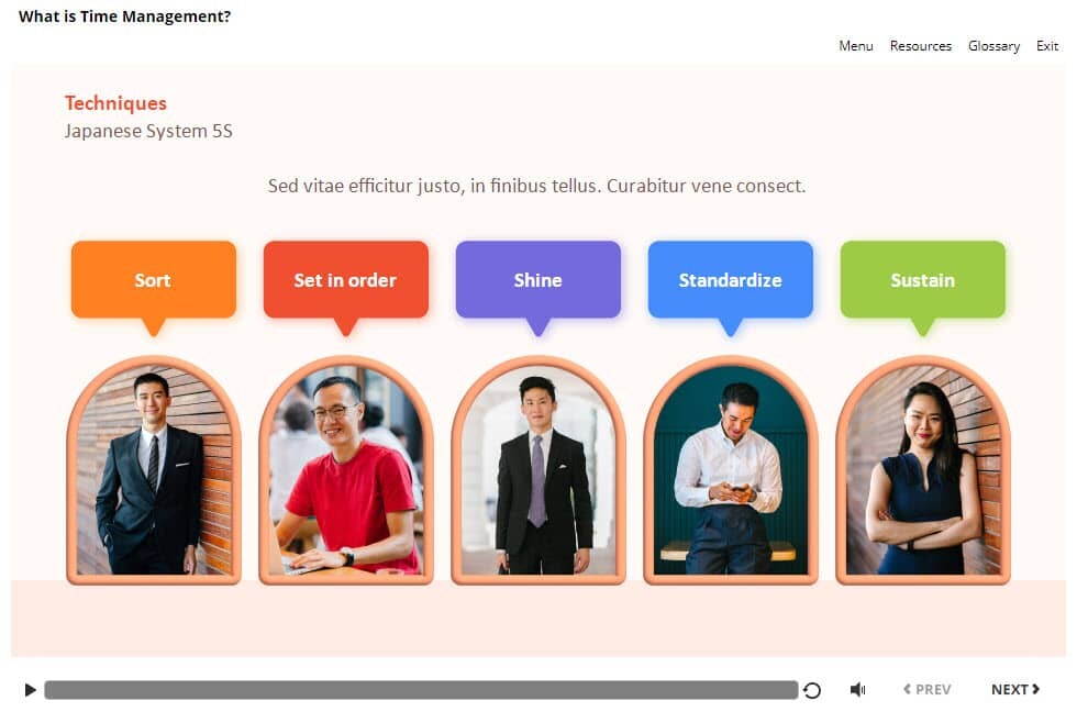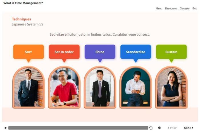 Japanese System 5S — Storyline Template. The unique eLearning interaction is designed with Articulate Storyline 360 software. The template contains five buttons that are illustrated with various people’s images. The user must click on each tab to reveal the additional information. The template is a ready-made product: all you need is to insert it into the projects and fill with own training content. It’s recommended to launch it on the devices with the screen size more than 7 inches.
