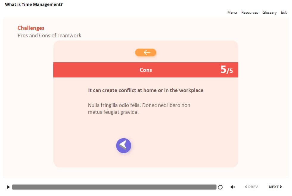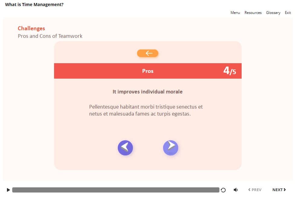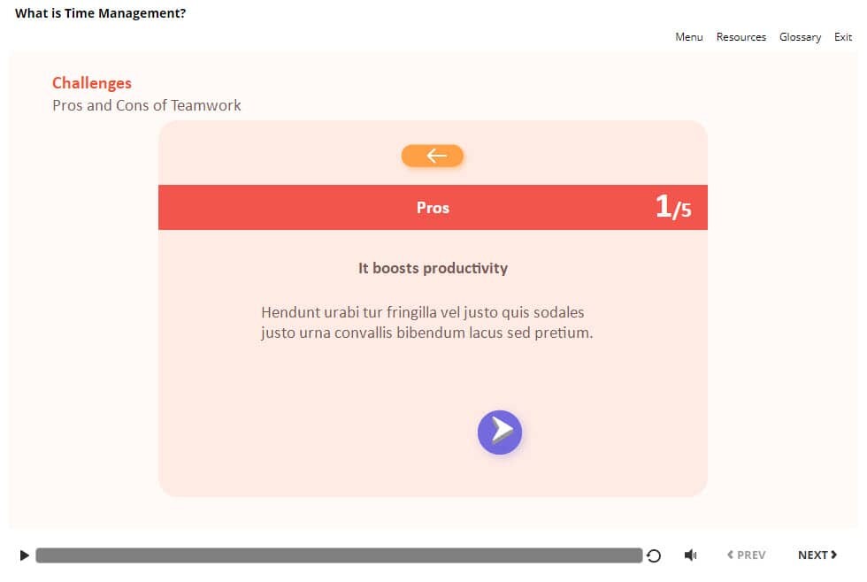 Teamwork Pros and Cons — Storyline Template. The unique eLearning interaction is designed with Articulate Storyline 360 software. The template is composed of two clickable cards. Each card contains a 5-slide slideshow with right and left navigation arrows. The user must click of each cards and view all slides of each slideshow to reveal the additional information. The template is a ready-made product: all you need is to insert it into the projects and fill with own training content. It’s recommended to launch it on the devices with the screen size more than 7 inches.
