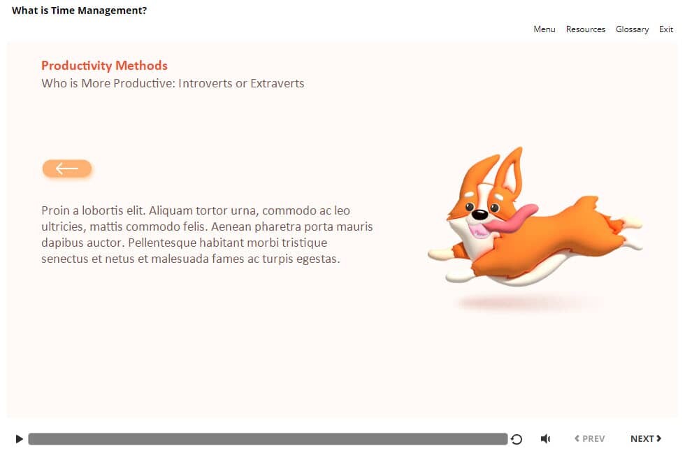 Introverts vs Extraverts — Storyline Template. The unique eLearning interaction is designed with Articulate Storyline 360 software. The template contains two buttons that are illustrated with the pictures of dogs. The user must click on each button to reveal the additional information. The template is a ready-made product: all you need is to insert it into the projects and fill with own training content. It’s recommended to launch it on the devices with the screen size more than 7 inches.
