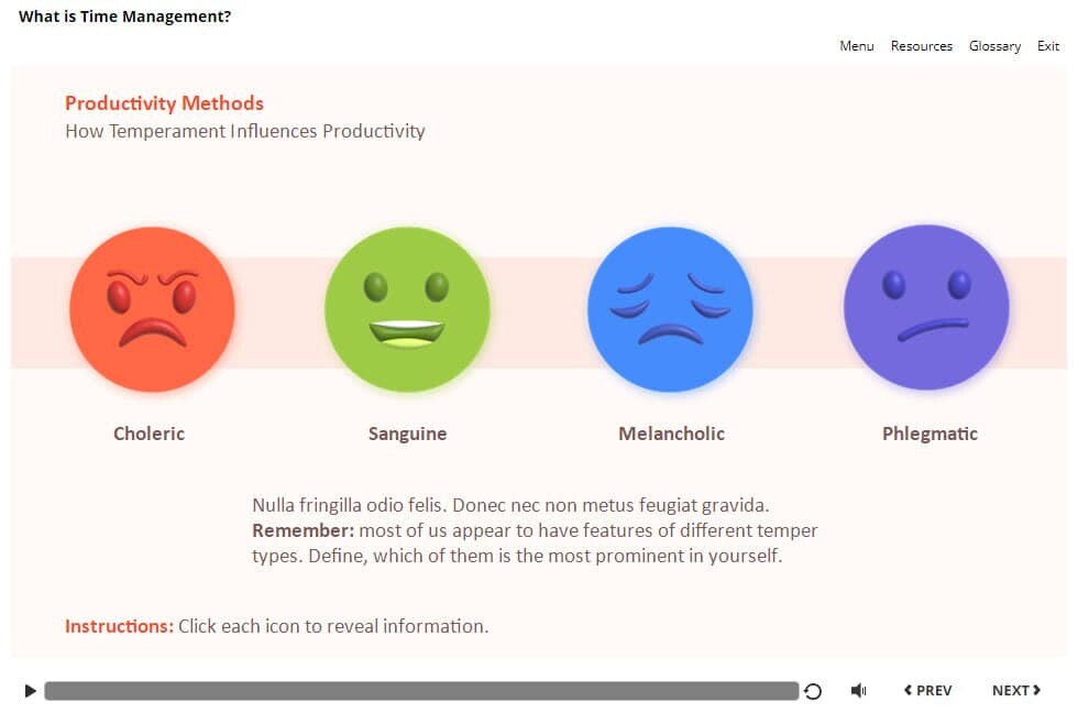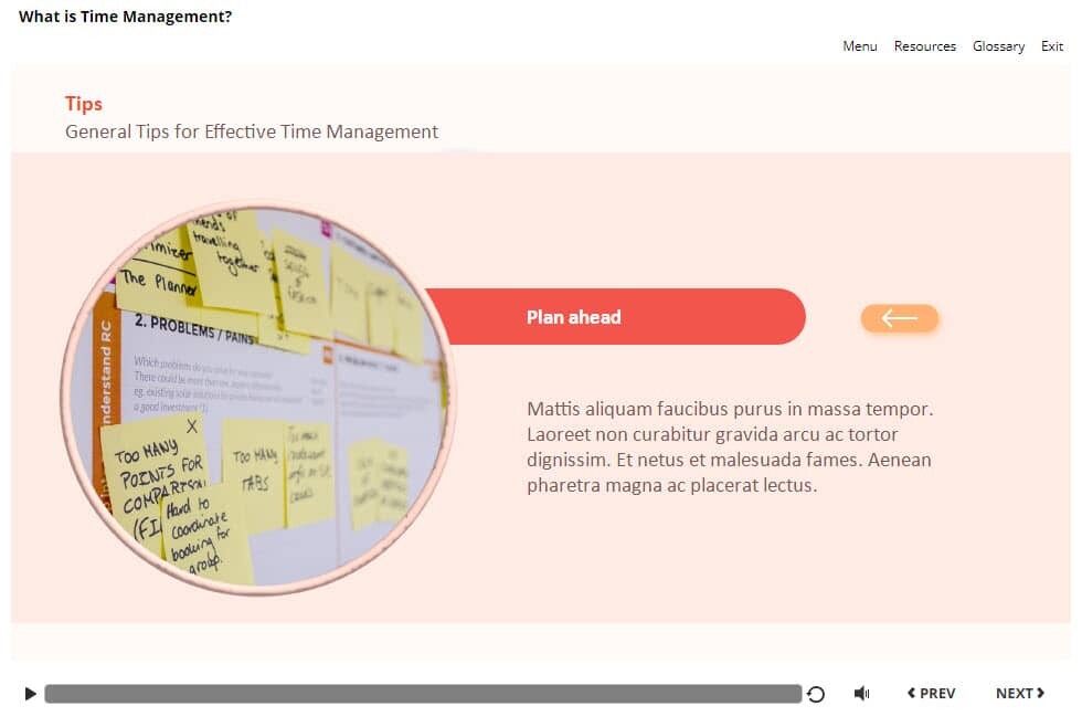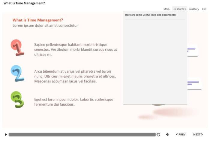 The Storyline Time Management Course Template is already designed and prepared for usage. You can launch and view it on mobile devices in off-line mode by downloading Articulate Mobile Player for iOS and Android. Storyline samples are very popular among e-course developers. This tool offers a wide range of features that makes Articulate Storyline templates unique and innovative.