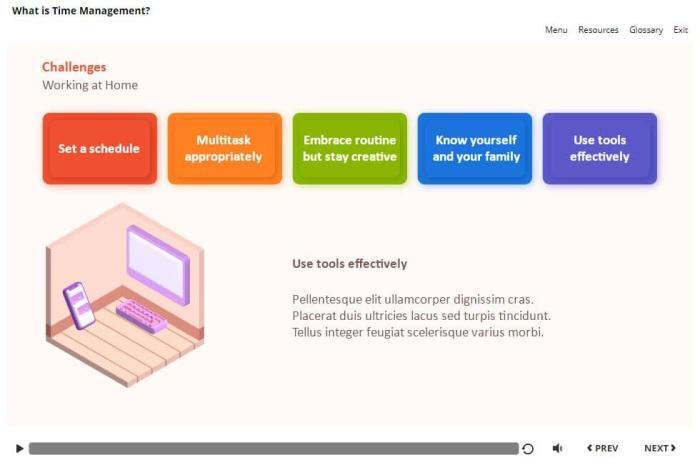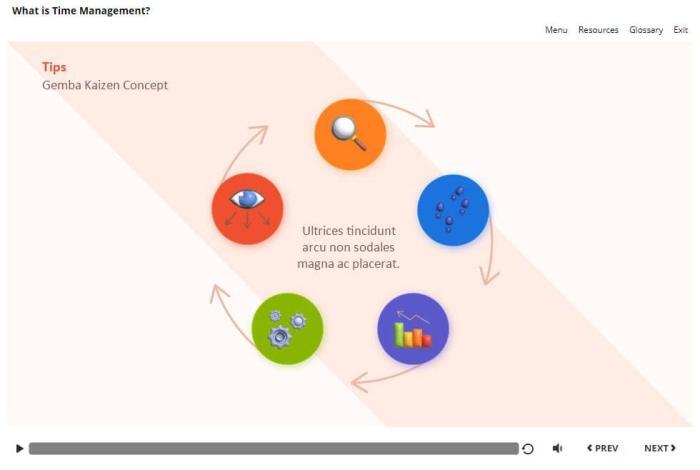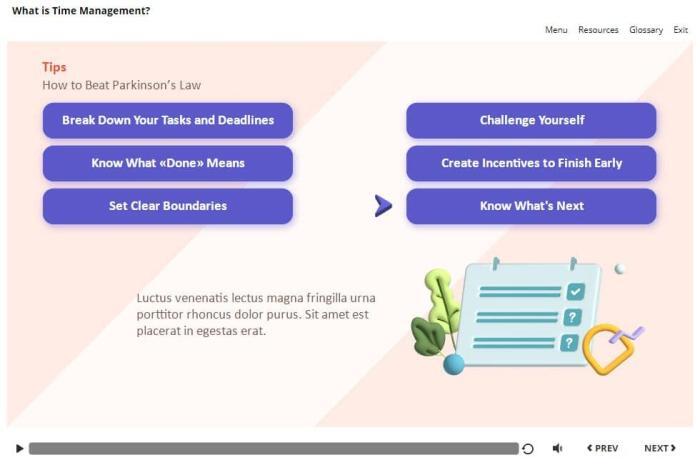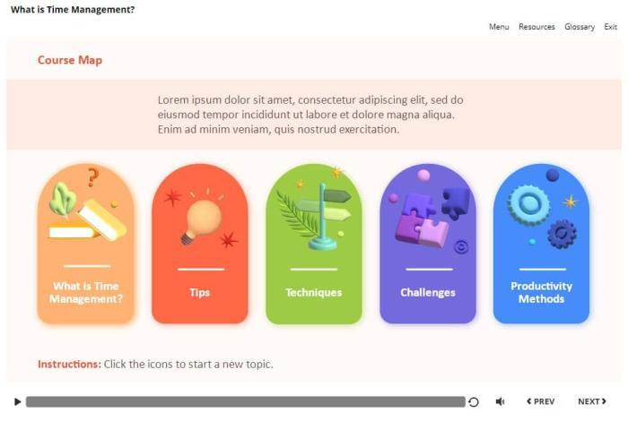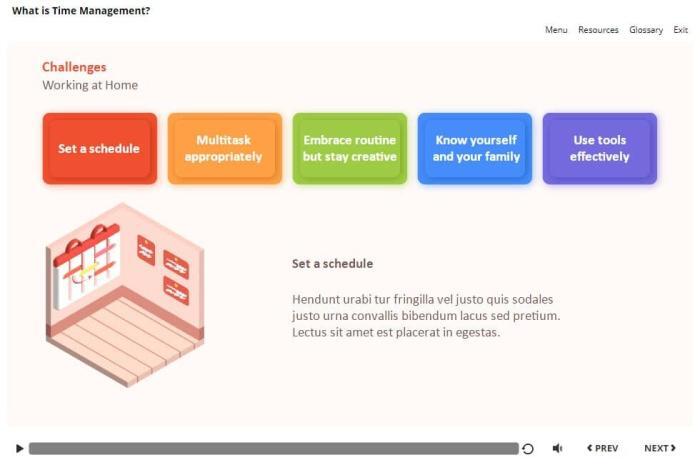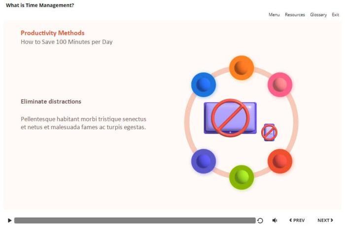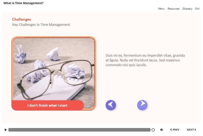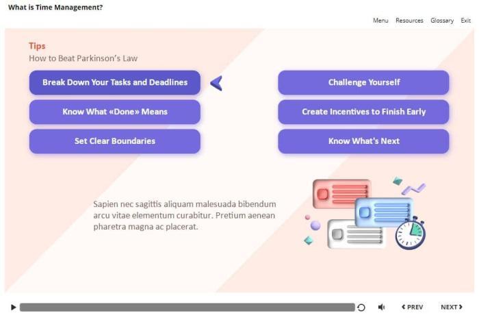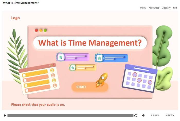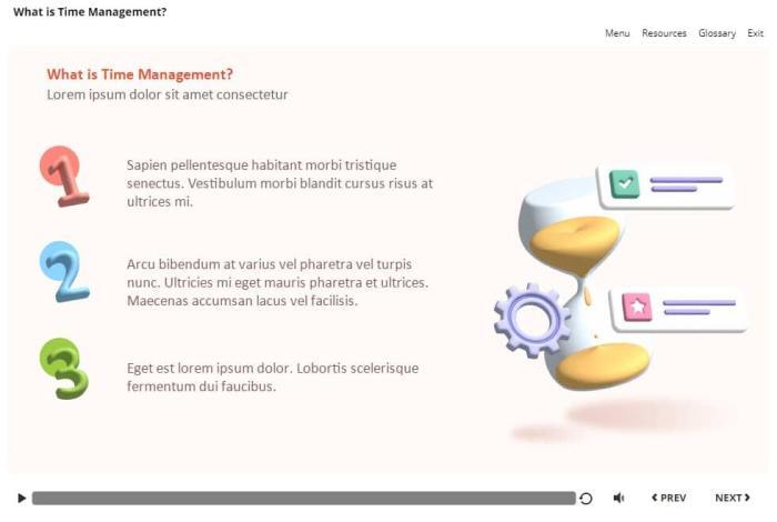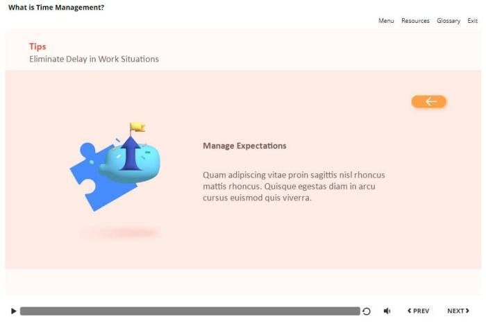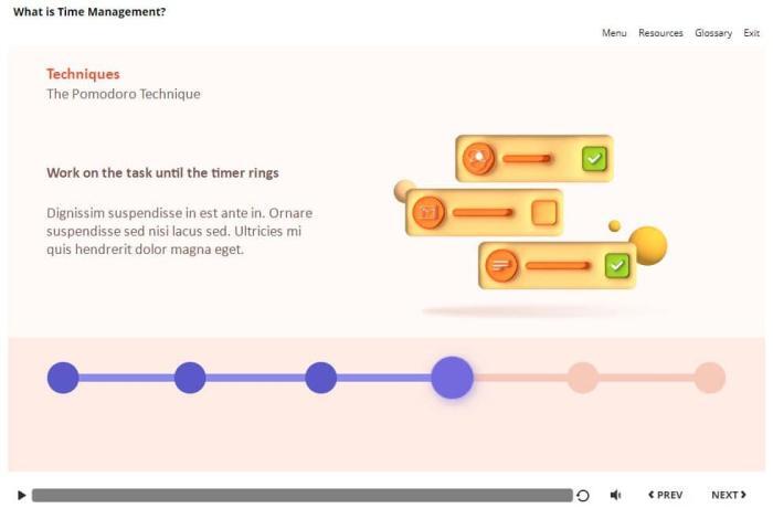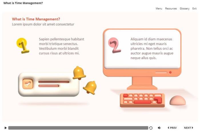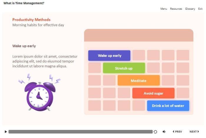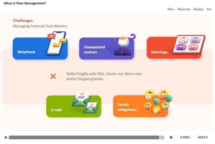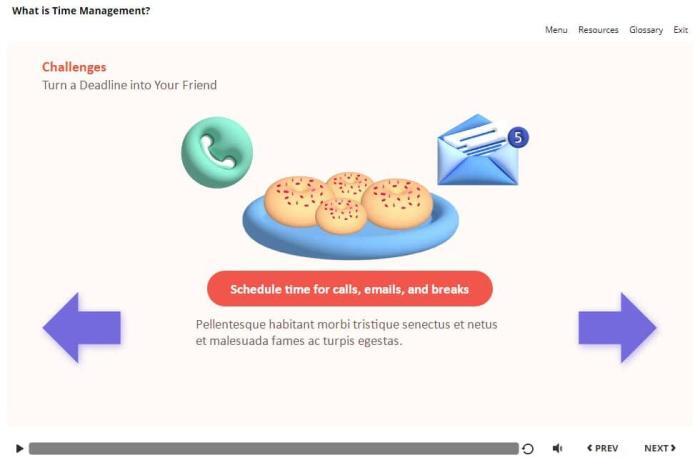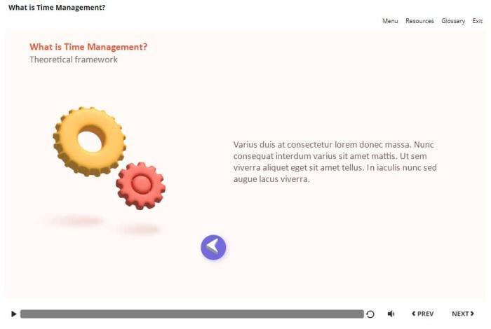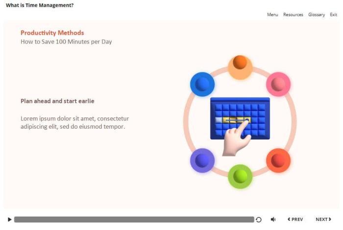 Time Management Course Starter Template — Articulate Storyline. The highly-functional elearning asset is made to earn essential time management skills of your students that enhance productivity, organizational efficiency, and effective deadline management across various professional settings. It will definitely grab learners’ attention. The template is composed of 76 layouts and interactive slides in order to help you develop your own training course and to improve the employee’s time management skills and techniques.