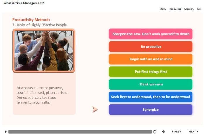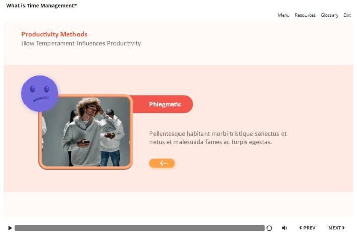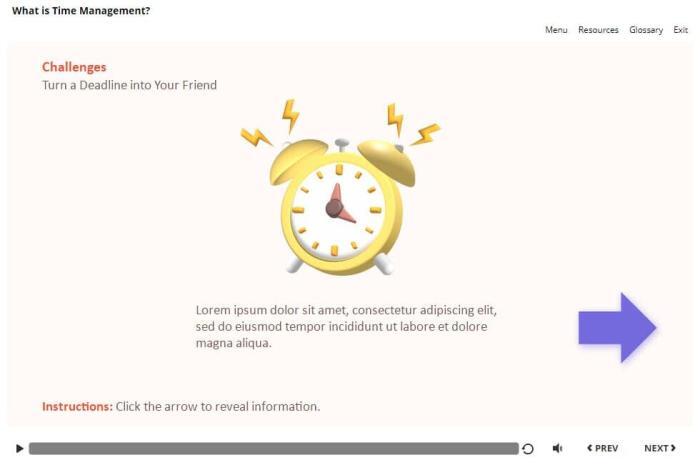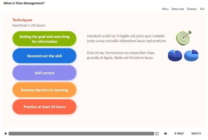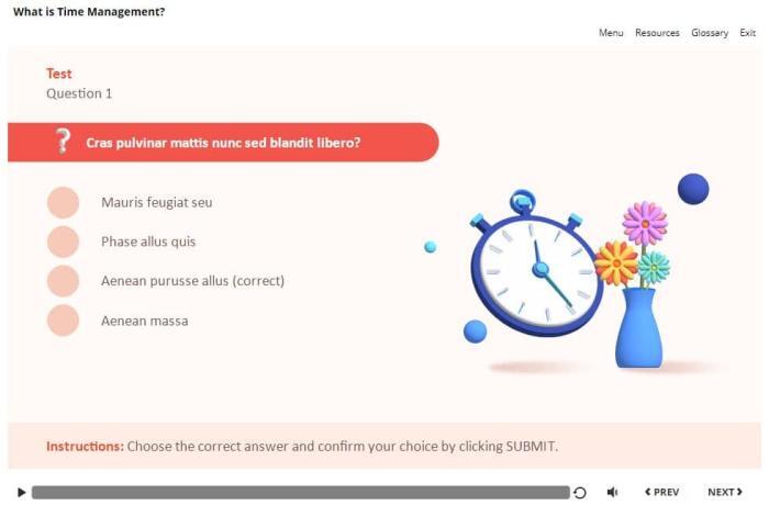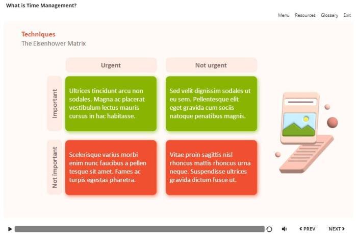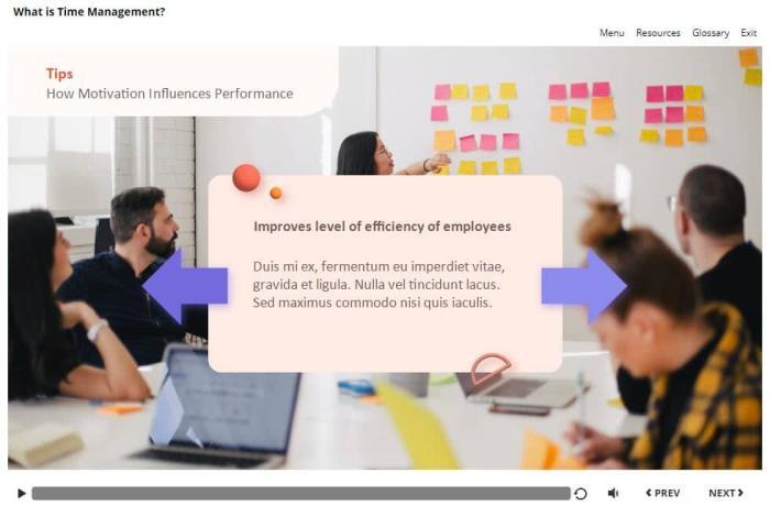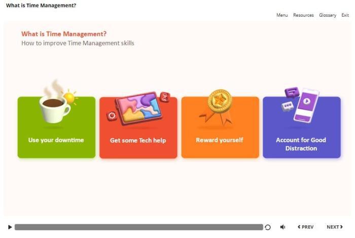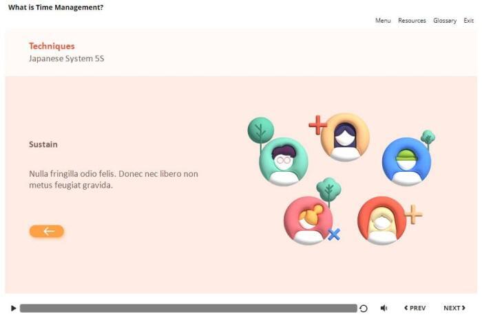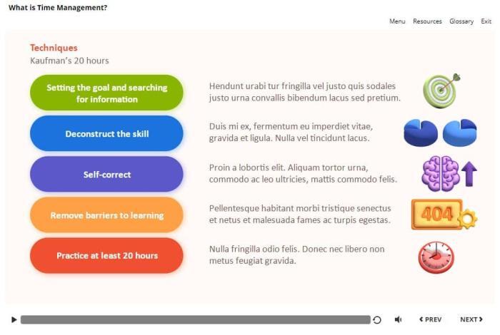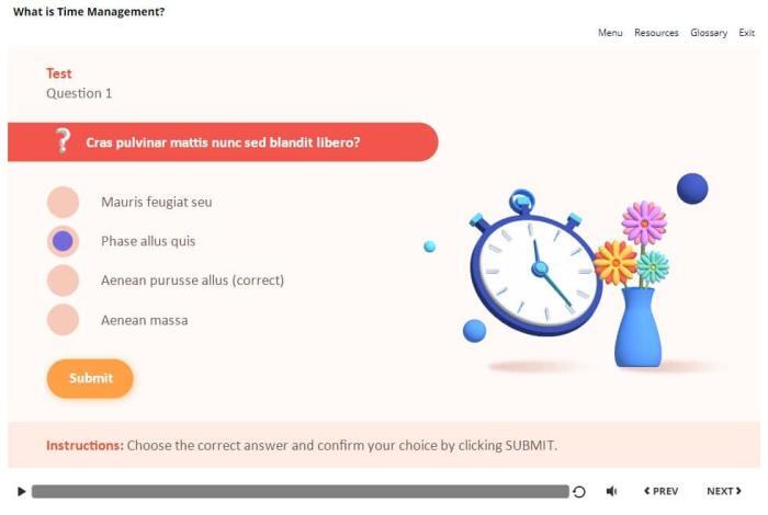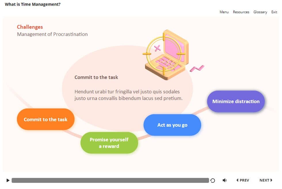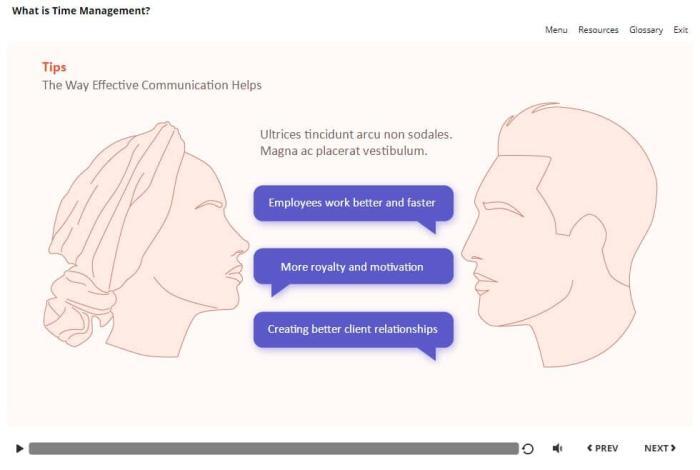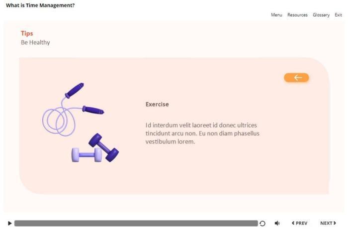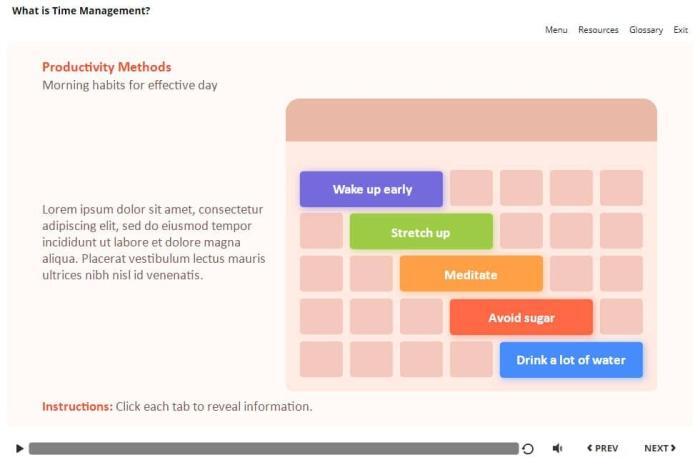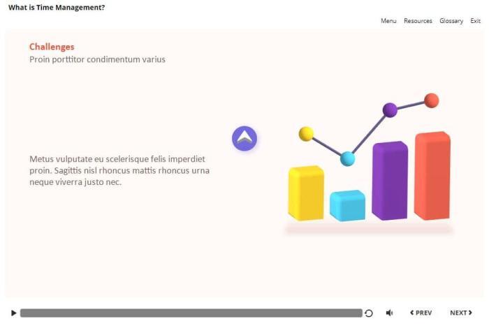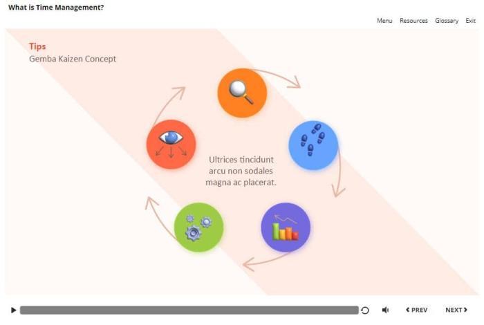 Time Management Course Starter Template — Articulate Storyline. The highly-functional elearning asset is made to earn essential time management skills of your students that enhance productivity, organizational efficiency, and effective deadline management across various professional settings. It will definitely grab learners’ attention. The template is composed of 76 layouts and interactive slides in order to help you develop your own training course and to improve the employee’s time management skills and techniques.