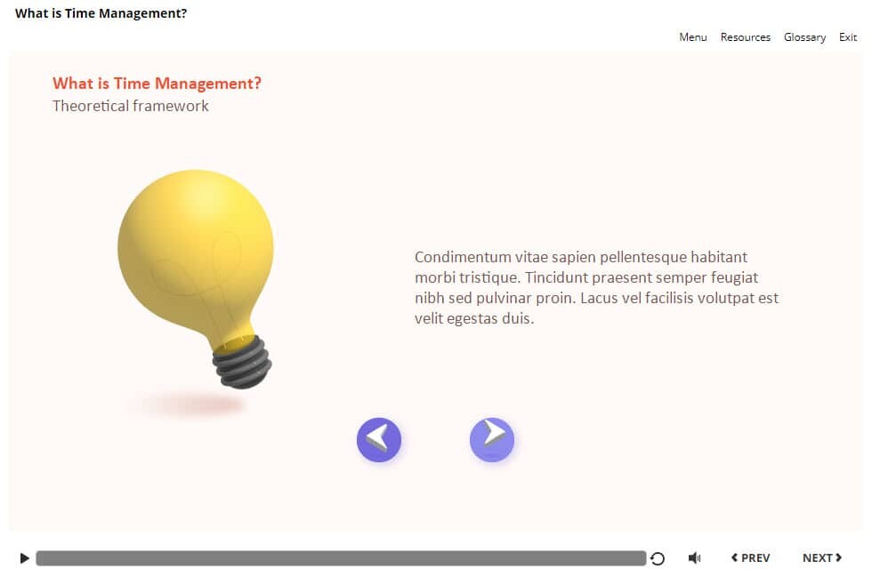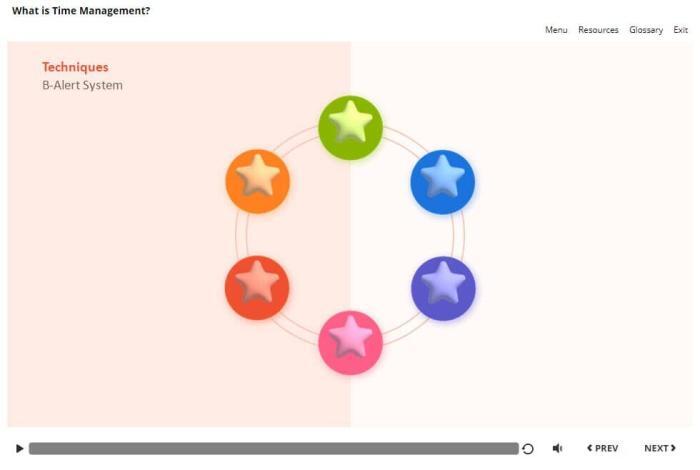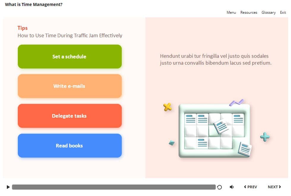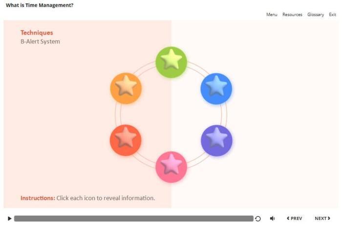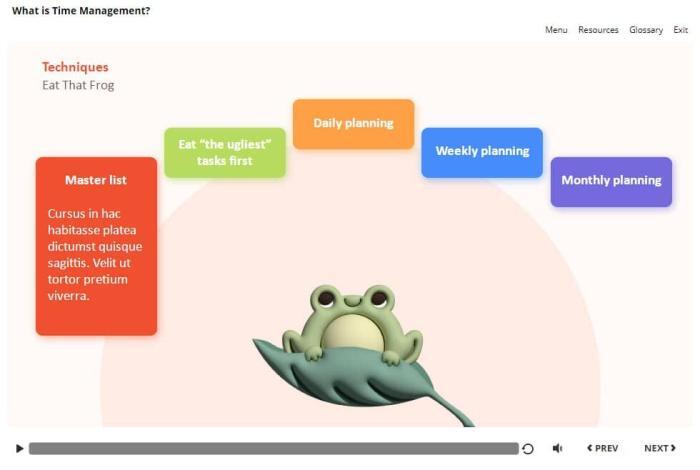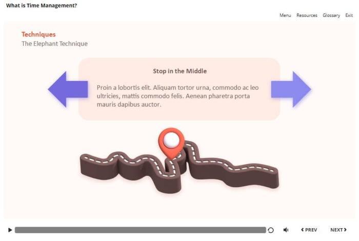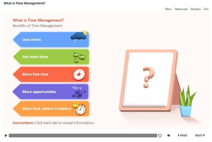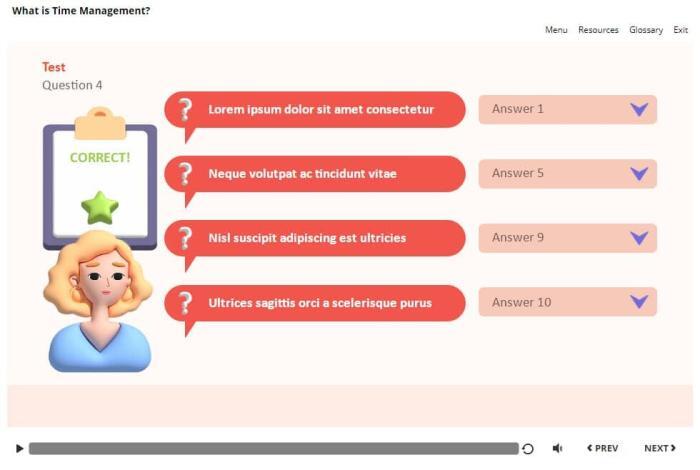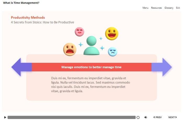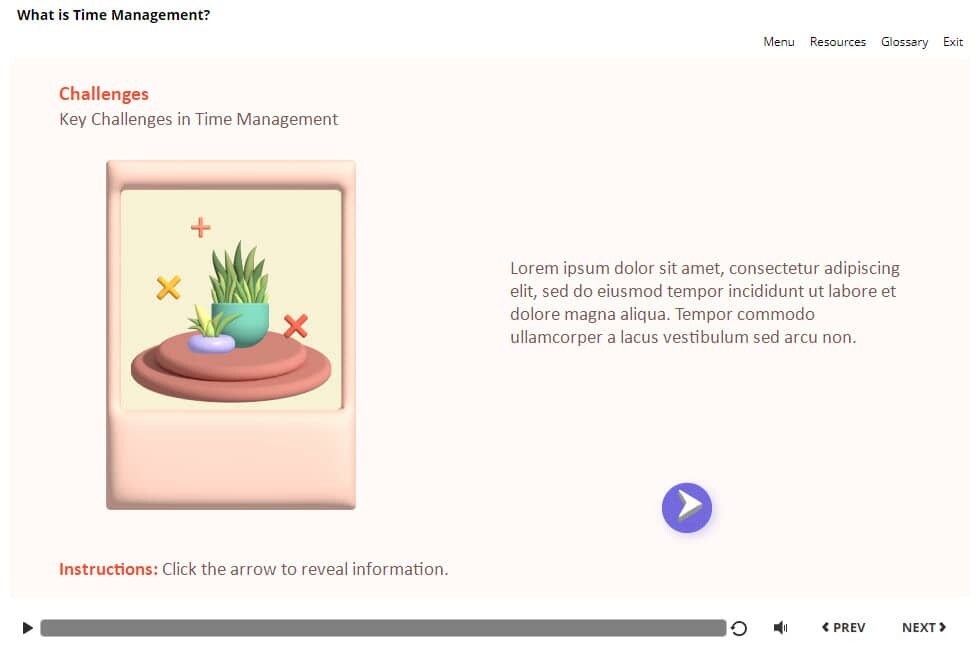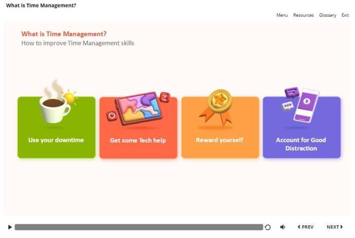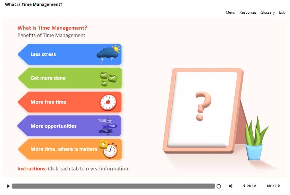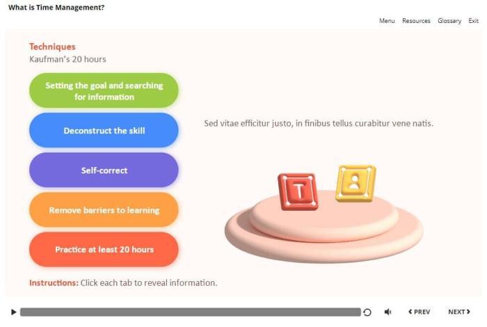 Time Management Course Starter Template — Articulate Storyline. The highly-functional elearning asset is made to earn essential time management skills of your students that enhance productivity, organizational efficiency, and effective deadline management across various professional settings. It will definitely grab learners’ attention. The template is composed of 76 layouts and interactive slides in order to help you develop your own training course and to improve the employee’s time management skills and techniques.