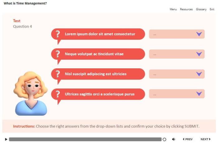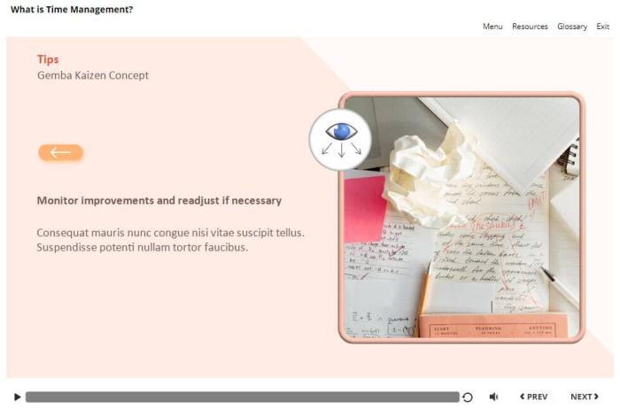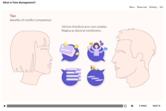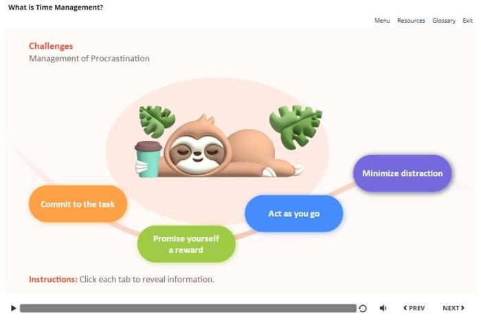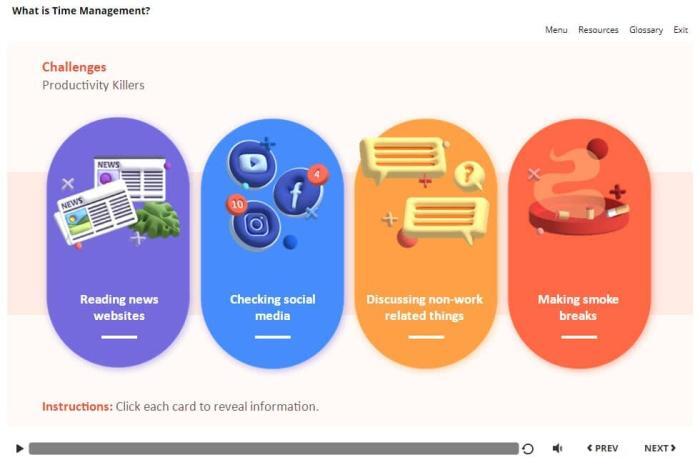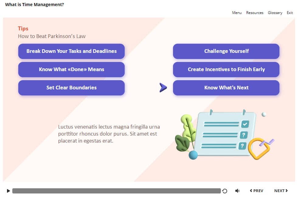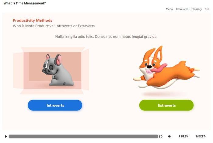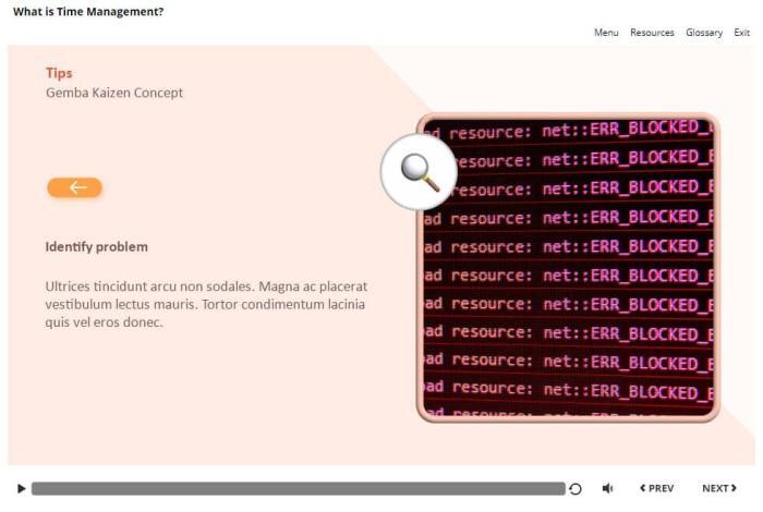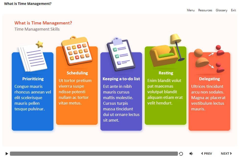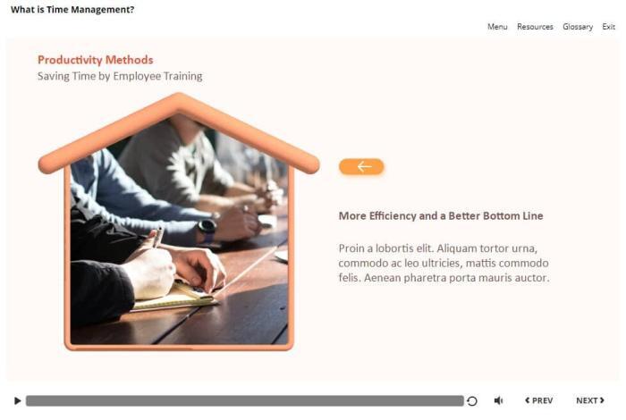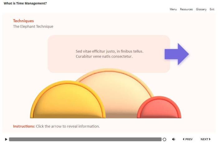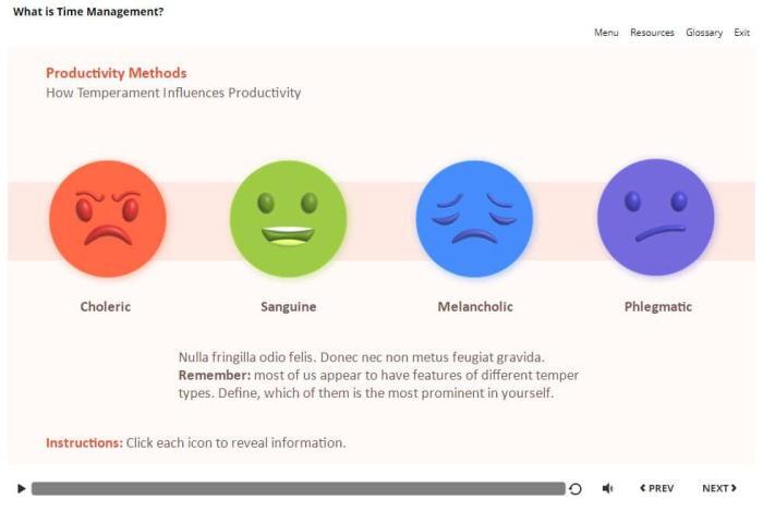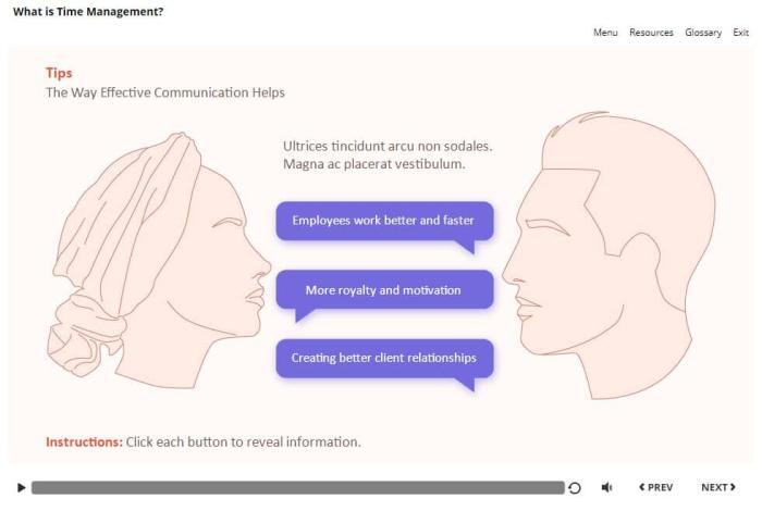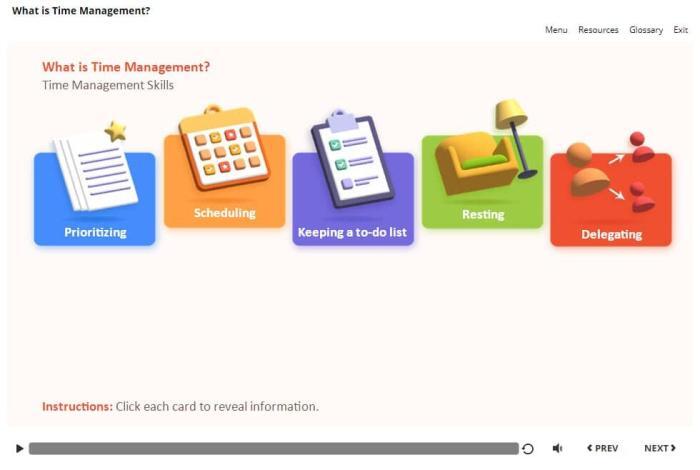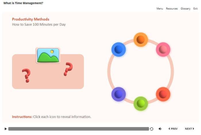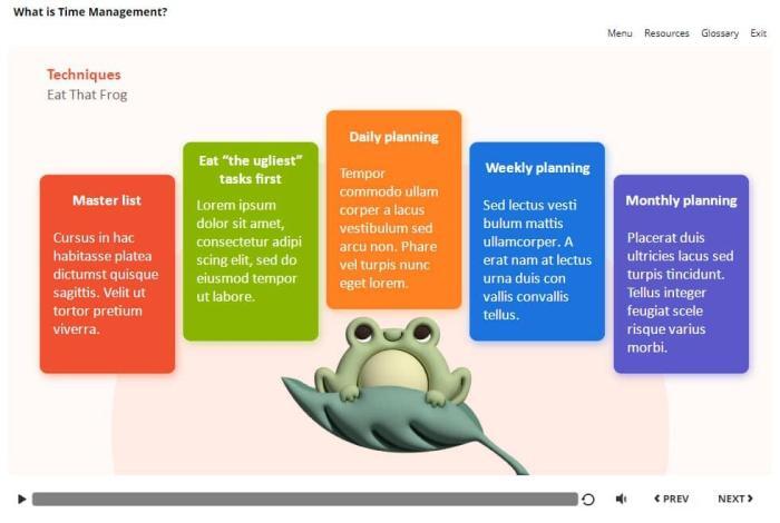 Time Management Course Starter Template — Articulate Storyline. The highly-functional elearning asset is made to earn essential time management skills of your students that enhance productivity, organizational efficiency, and effective deadline management across various professional settings. It will definitely grab learners’ attention. The template is composed of 76 layouts and interactive slides in order to help you develop your own training course and to improve the employee’s time management skills and techniques.