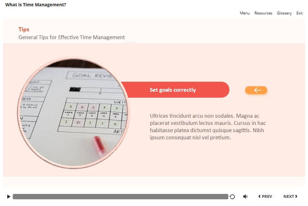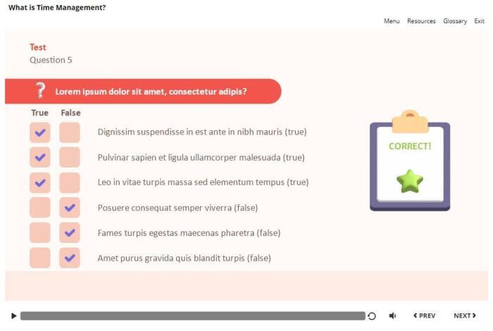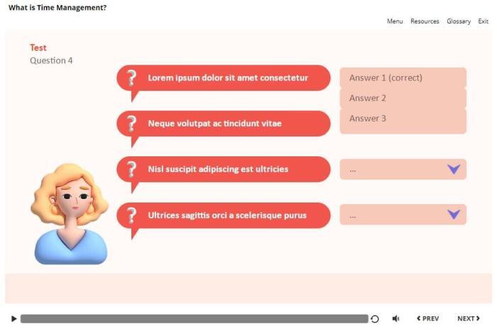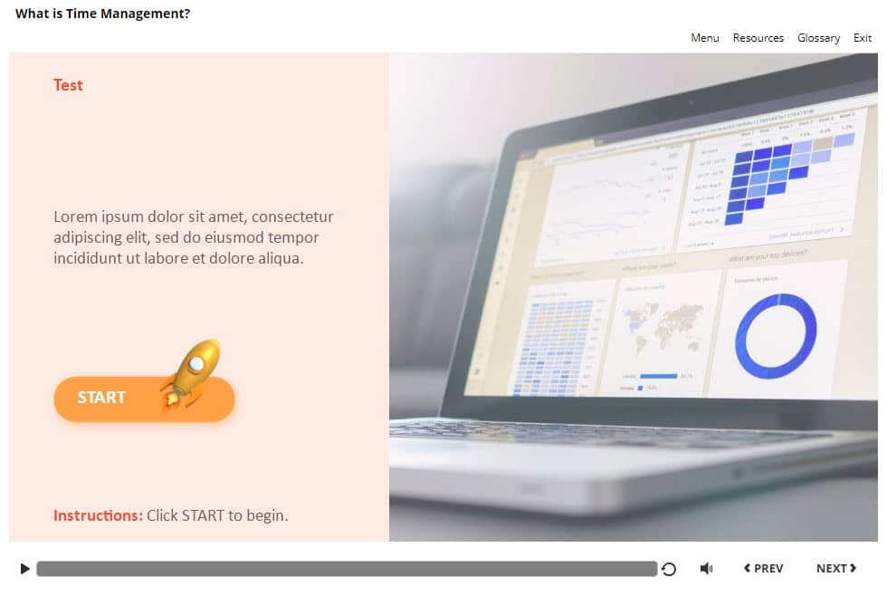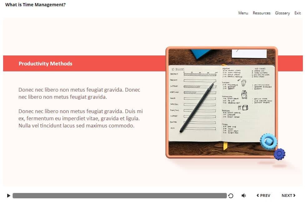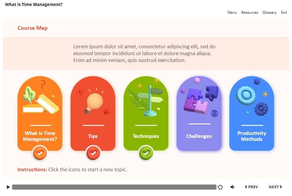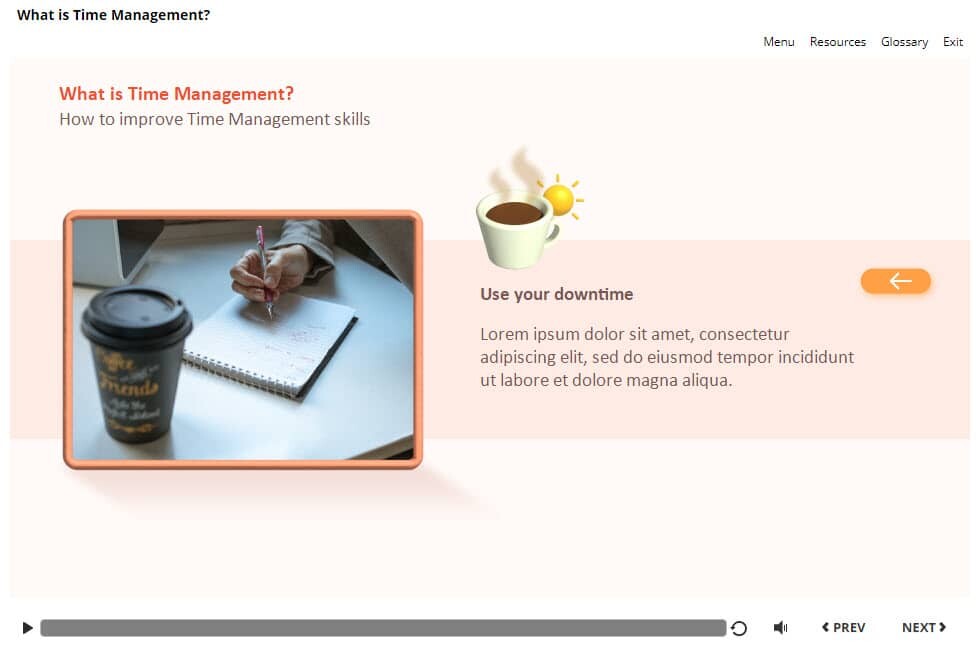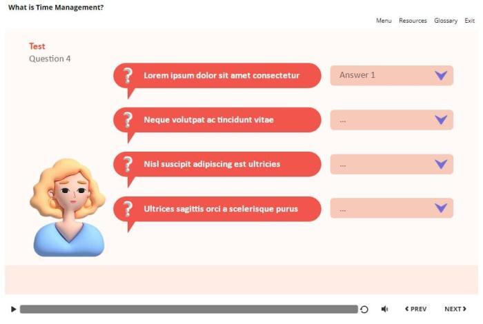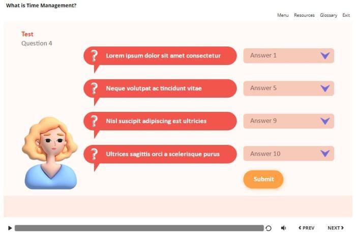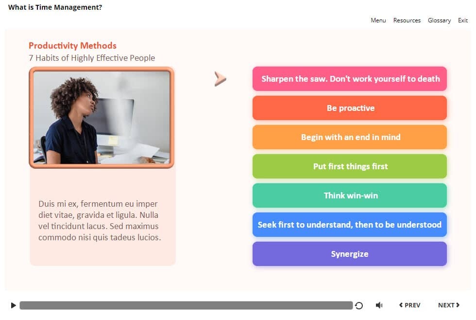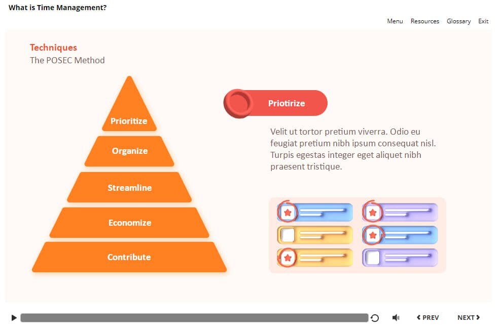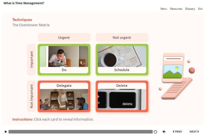 Time Management Course Starter Template — Articulate Storyline. The highly-functional elearning asset is made to earn essential time management skills of your students that enhance productivity, organizational efficiency, and effective deadline management across various professional settings. It will definitely grab learners’ attention. The template is composed of 76 layouts and interactive slides in order to help you develop your own training course and to improve the employee’s time management skills and techniques.