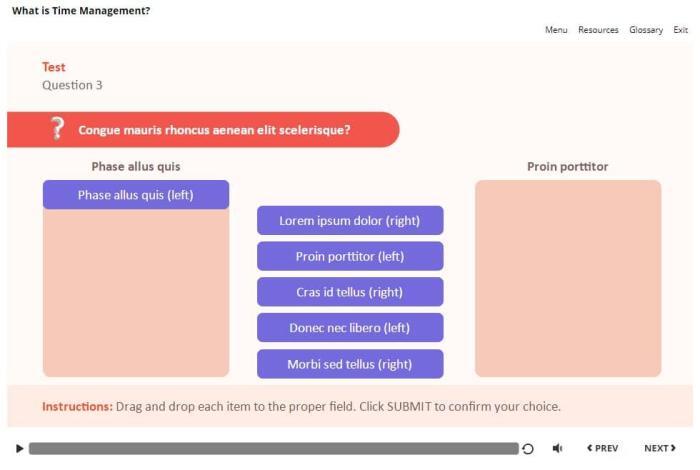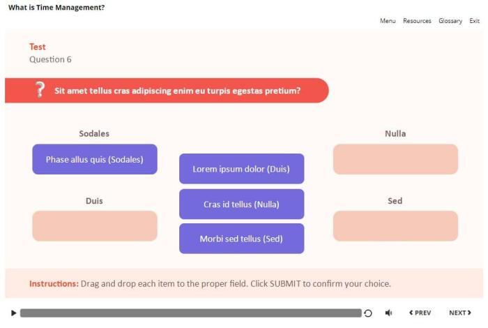 - Features: custom course map, standard navigation, standard voice/animation control, various versions of interactive slides, audio player, video player, single and multiple choice quizzes