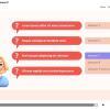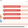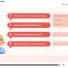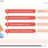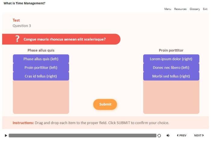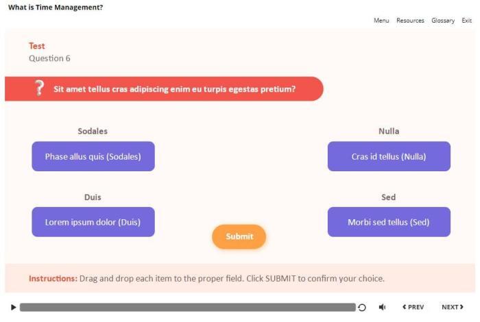 The course sample contains various versions of interactive slides such as text + image slides, infographics, flip cards, steps, dialogues, tabs and buttons slides, and many more to reveal the course information. The knowledge check module includes six tasks such as questions with single and multiple answer options, drag and drop quizzes, and a test with true / false answer options.