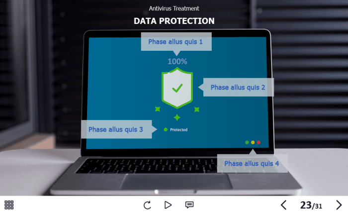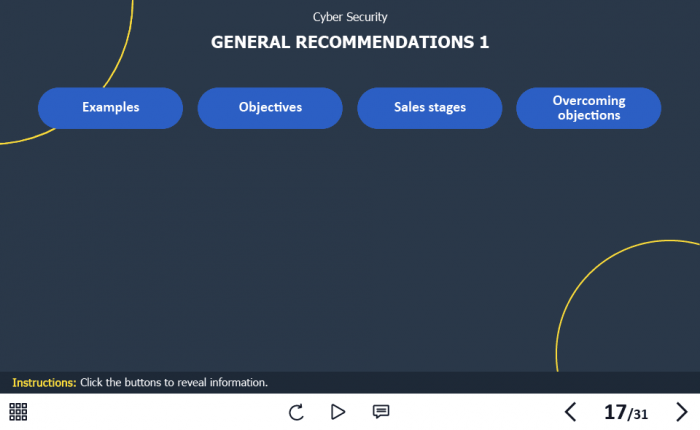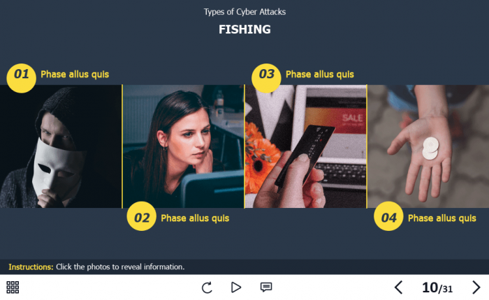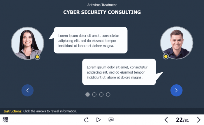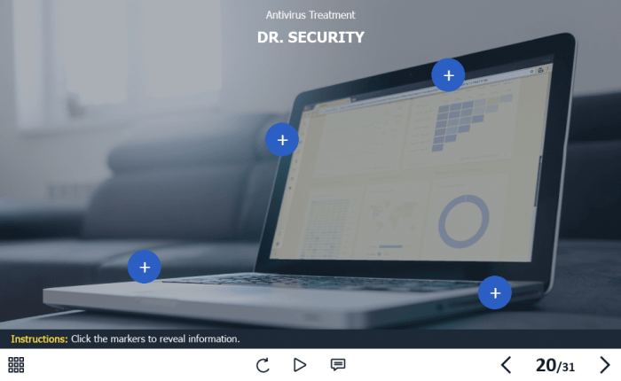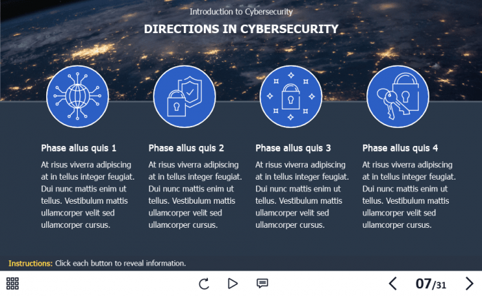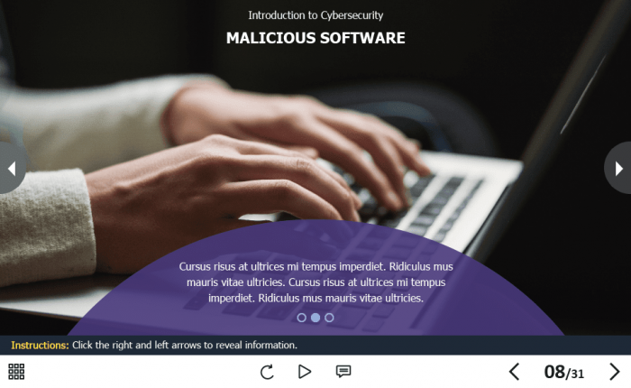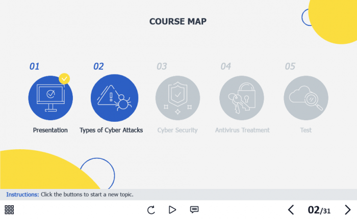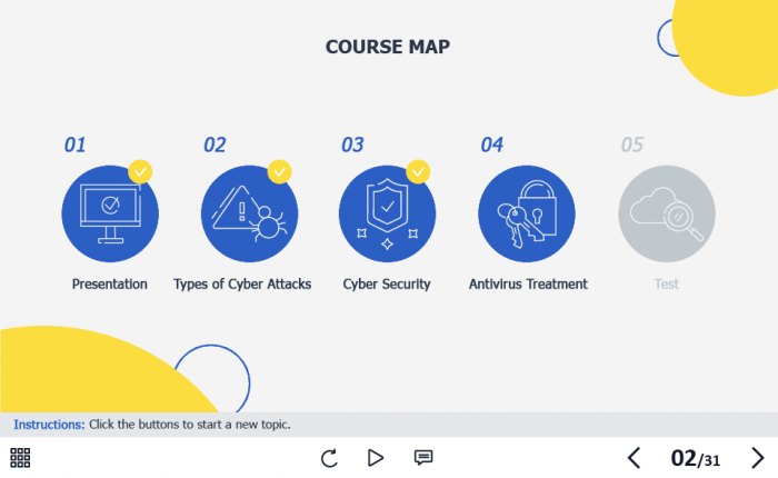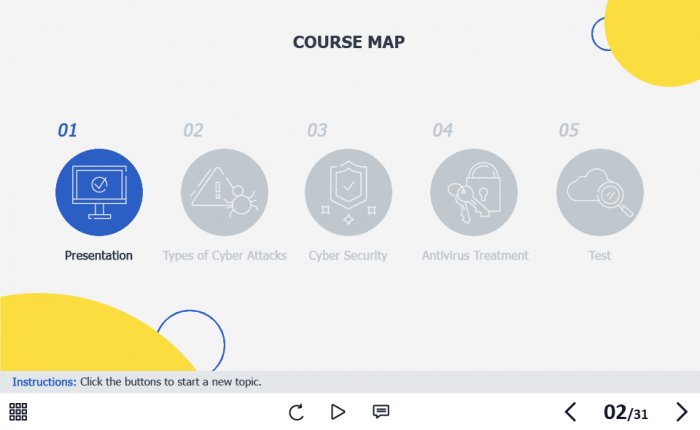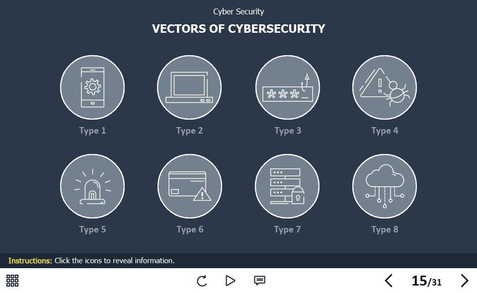 Cyber Security Course Starter Template — Adobe Captivate. The highly-functional elearning asset is developed for creating cybersecurity training courses for company employees. It contains a 31-slide template designed with Captivate 2019 authoring tool, and 32 unique vector icons that are used in the template.