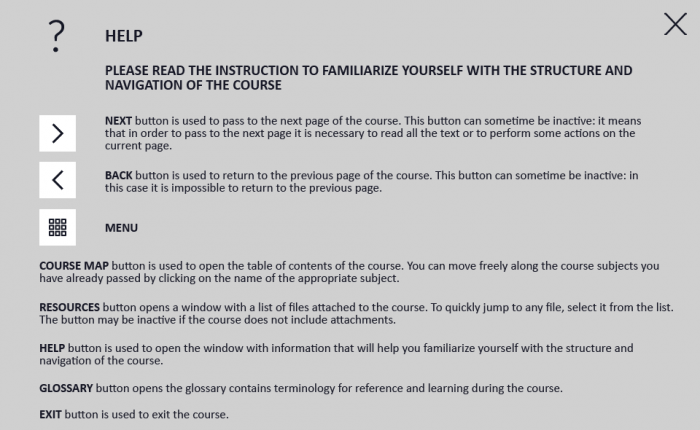 The course template is fully compatible with Adobe Captivate 2019. It can be launched on both PC and tablet. The navigation keys are located in the lower right part of the screen. It will be convenient to use the template on mobile devices with touchscreens larger than 7 inches. Vector icon source files are also included in the downloadable file.