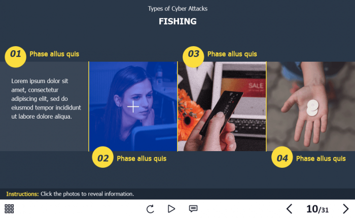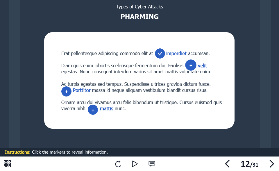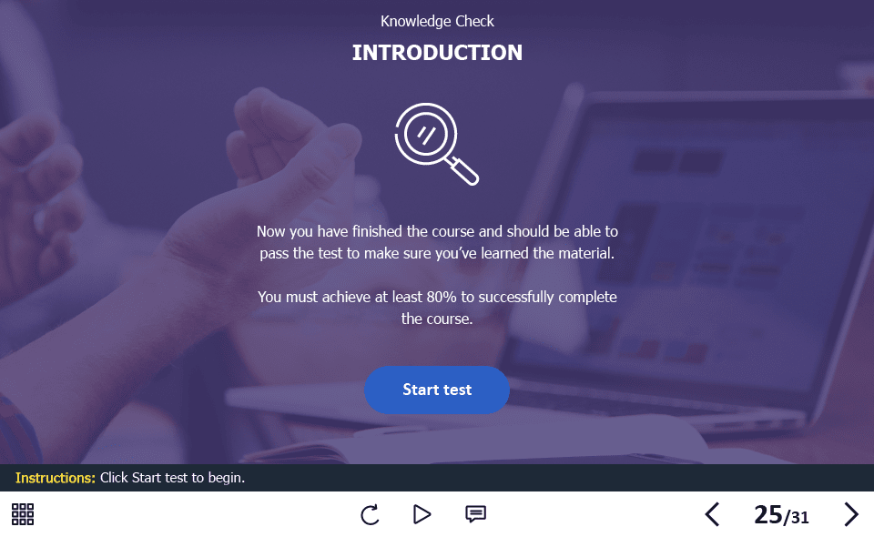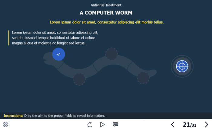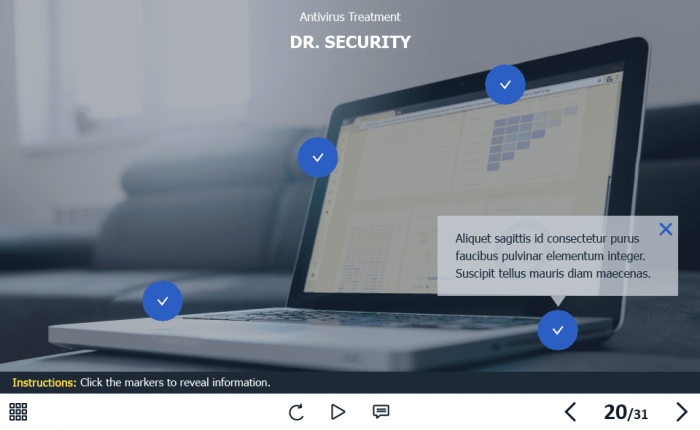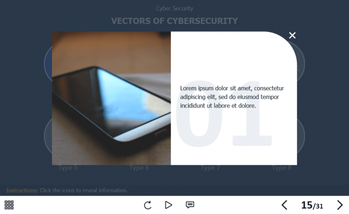 The course starter template is composed of 31 sample slides in order to help you develop your own training course and to improve the employee’s knowledge in the field of cyber security. It contains various versions of interactive slides such as text + image slides, steps, pop-ups, slideshows, and many others that are created to reveal the course information. The knowledge check module includes several tasks such as questions with single and multiple answer options, and drag and drop quizzes. The course transfers results to LMS according to SCORM, AICC, Tin Can API standards.