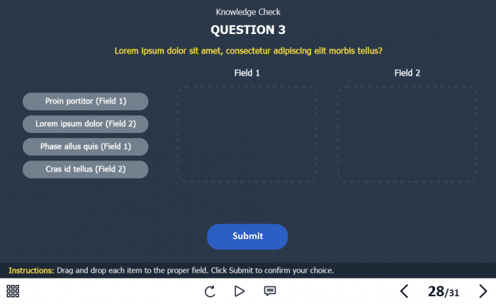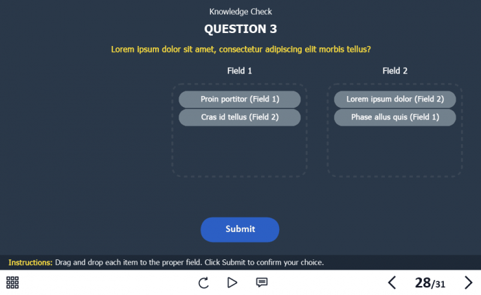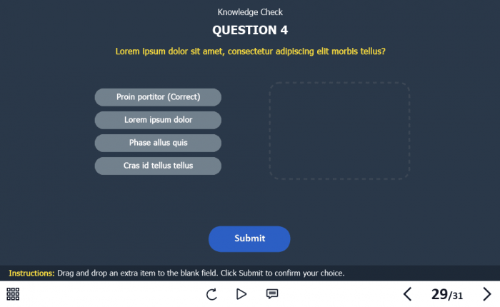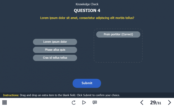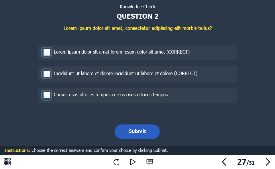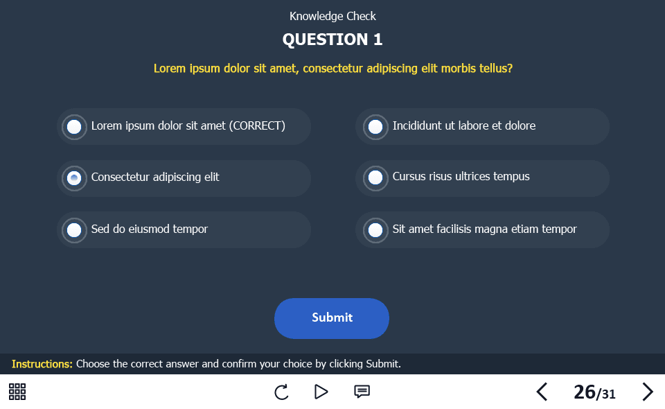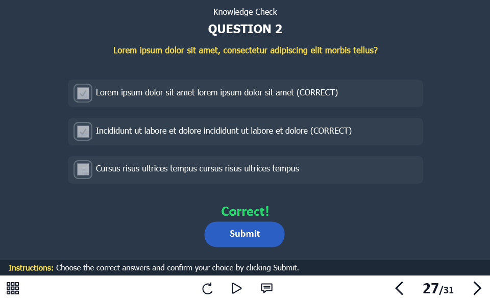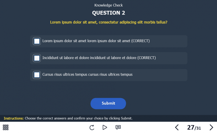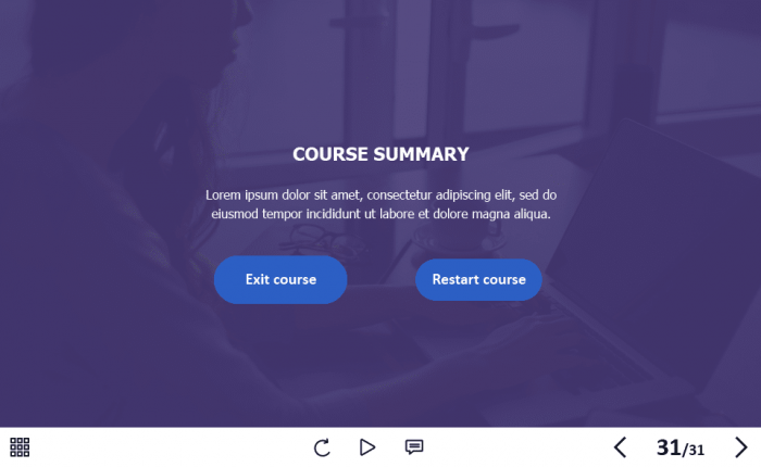 - Features: custom course map, standard navigation, standard voice/animation control, various versions of interactive slides, video player, single and multiple choice quizzes, 32 unique vector icons