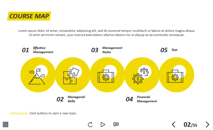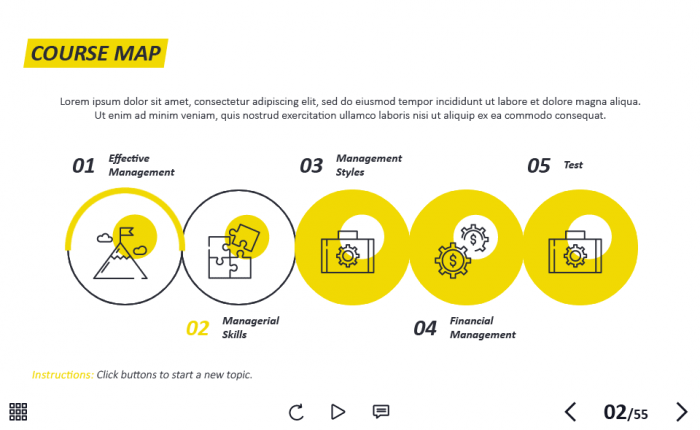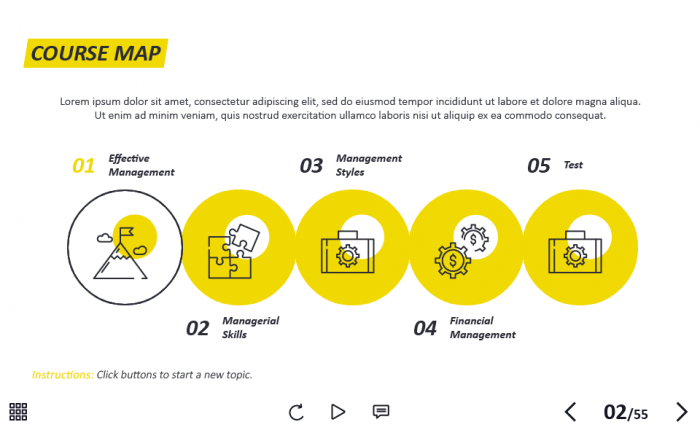 Management and Finances Course Starter Template — Adobe Captivate. The highly-functional elearning asset is developed for creating training courses for specialists in management and finance. It contains a large elearning template designed with Captivate 2019 authoring tool, and a pack of well-designed vector icons that are used in the template.