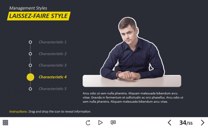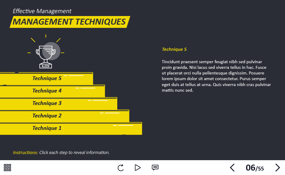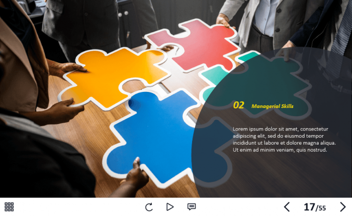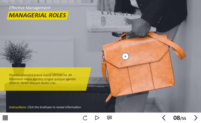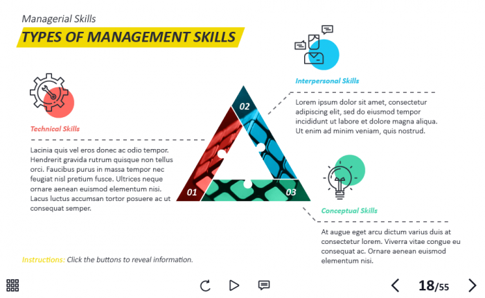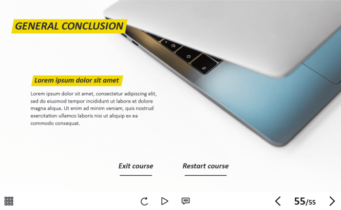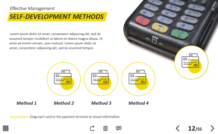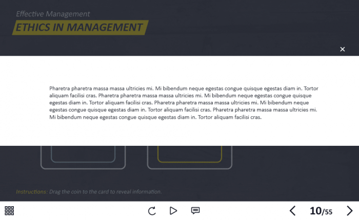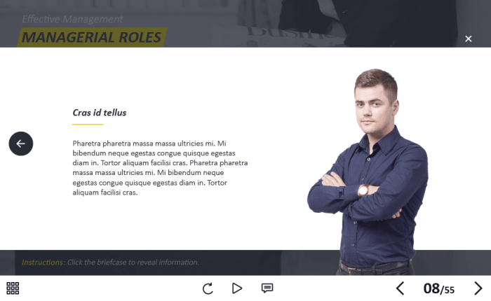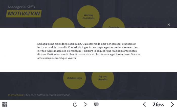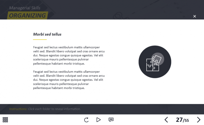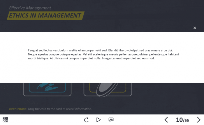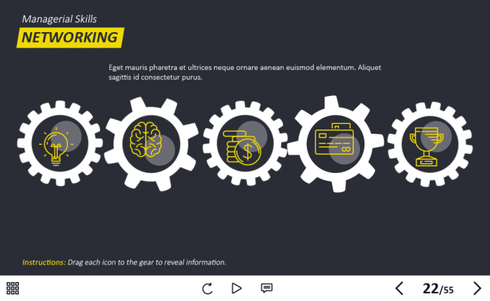 The course starter template is composed of 55 slides in order to help you develop your own training course and to improve the learner’s knowledge regarding managerial and financial issues. It contains various versions of interactive slides such as text + image slides, steps, pop-ups, slideshows, and many others that are created to reveal the course information. The knowledge check module includes several tasks such as questions with single and multiple answer options, and drag and drop quizzes. The course transfers results to LMS according to SCORM, AICC, Tin Can API standards.