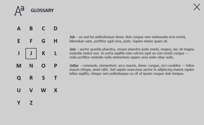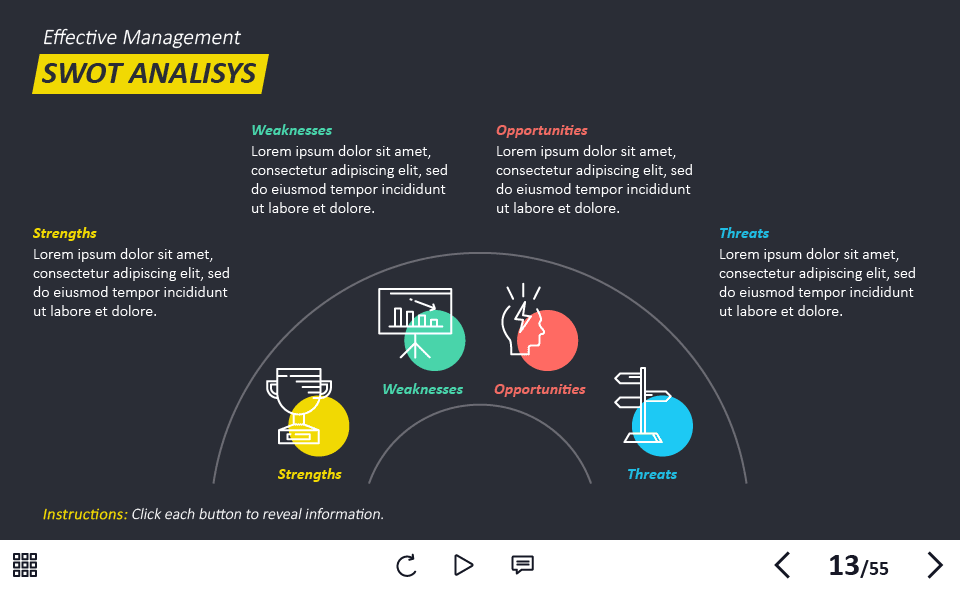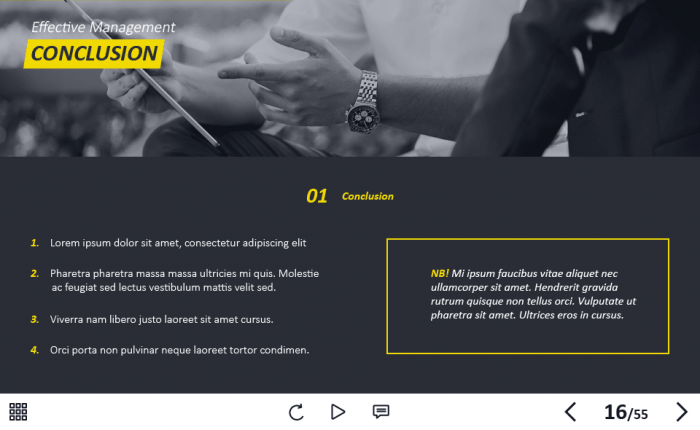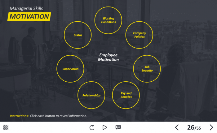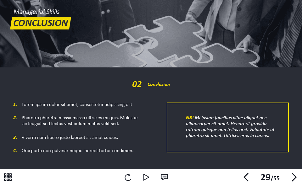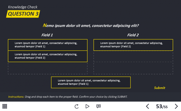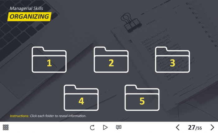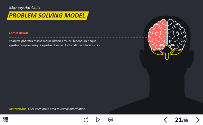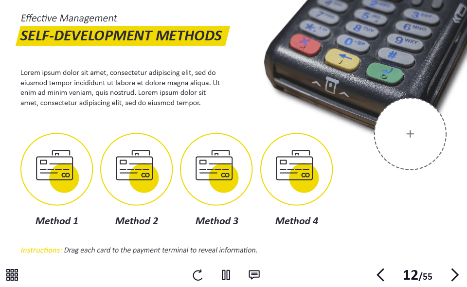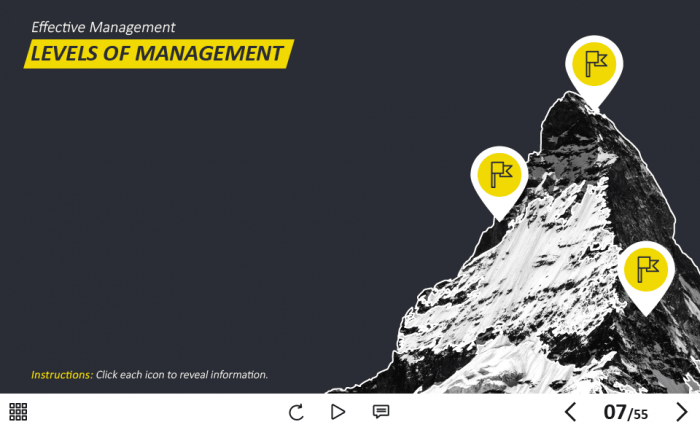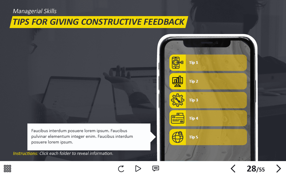 The course starter template is composed of 55 slides in order to help you develop your own training course and to improve the learner’s knowledge regarding managerial and financial issues. It contains various versions of interactive slides such as text + image slides, steps, pop-ups, slideshows, and many others that are created to reveal the course information. The knowledge check module includes several tasks such as questions with single and multiple answer options, and drag and drop quizzes. The course transfers results to LMS according to SCORM, AICC, Tin Can API standards.