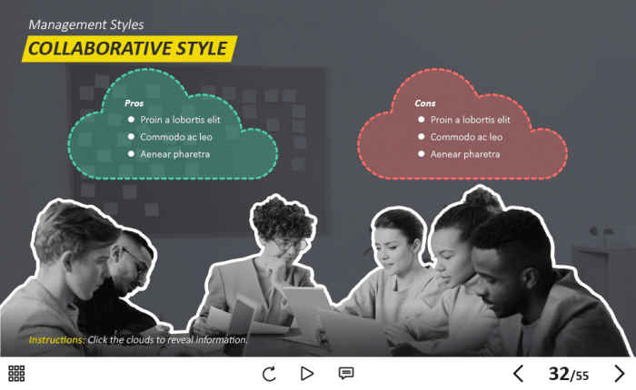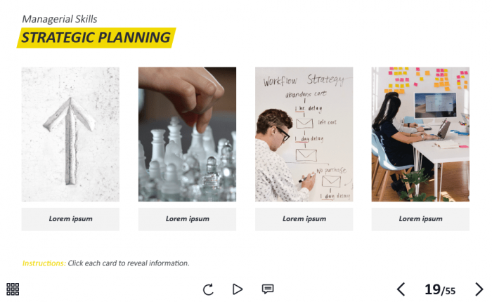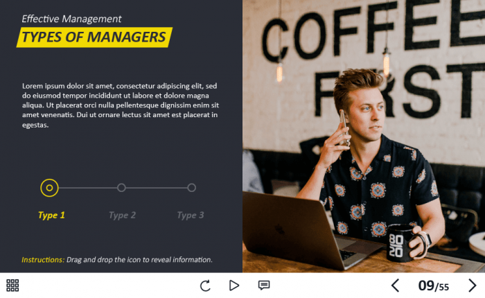 - Types of slides: title, image + text, video slide, slides with text + image, flip cards, tabs, steps, grids, slideshow, drag and drop, drop down, pre-test slide, slide with the course results