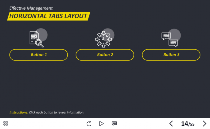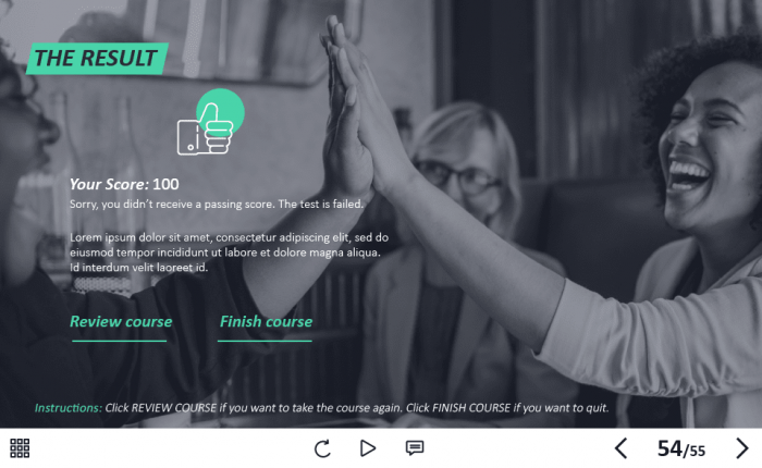 The course template is fully compatible with Adobe Captivate 2019. It can be launched on both PC and tablet. The navigation keys are located in the lower right part of the screen. It will be convenient to use the template on mobile devices with touchscreens larger than 7 inches. Characters and icons source files are included in the downloadable file.