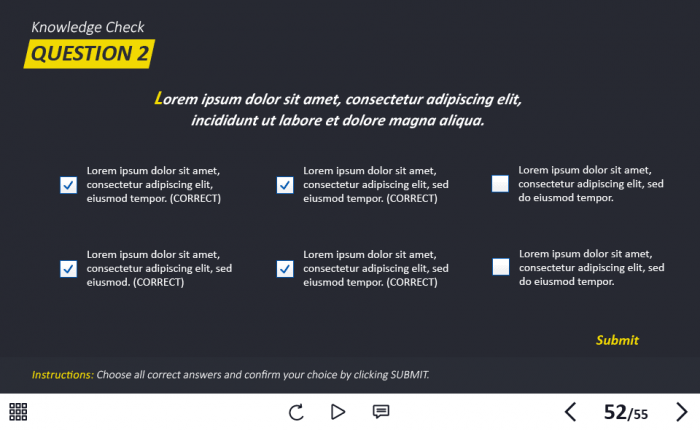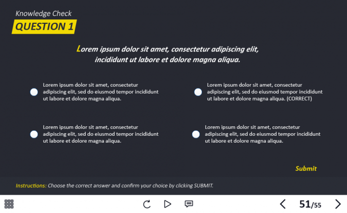 - Features: custom course map, standard navigation, standard voice/animation control, various versions of interactive slides, audio player, video player, single and multiple choice quizzes, unique vector icons pack
