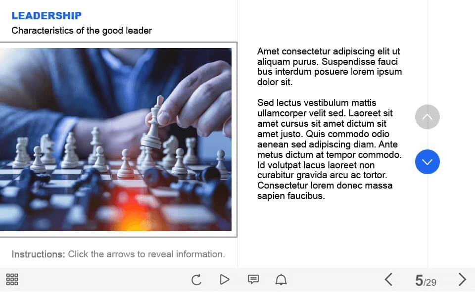 The course starter template is composed of 37 slides in order to help you develop your own training course and to improve the learner’s knowledge regarding soft skills. It contains various versions of interactive slides such as text + image slides, dialogues, tabs, slideshows, and many others that are created to reveal the course information. The knowledge check module includes several tasks such as questions with single and multiple answer options, and drag and drop quizzes. The course transfers results to LMS according to SCORM, AICC, Tin Can API standards.