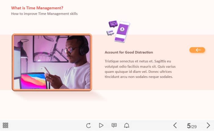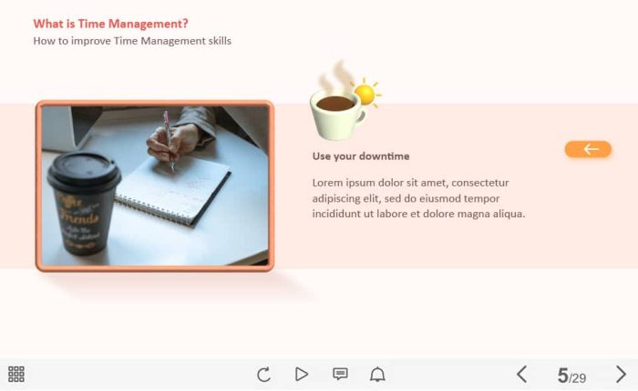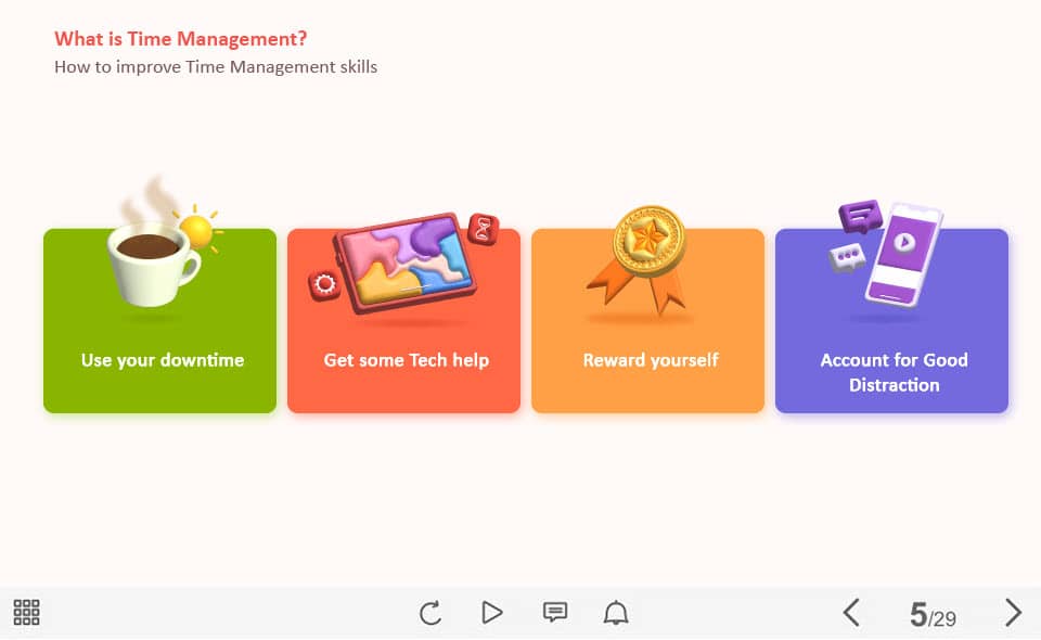 Time Management Cards — Captivate Template. The unique eLearning interaction is designed with Captivate 2019 software. The template contains four clickable objects designed as cards with icons. The user must click on each tab to reveal the additional information in pop-ups. The template is a ready-made product: all you need is to insert it into the projects and fill with own training content. It’s recommended to launch it on the devices with the screen size more than 7 inches.