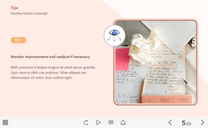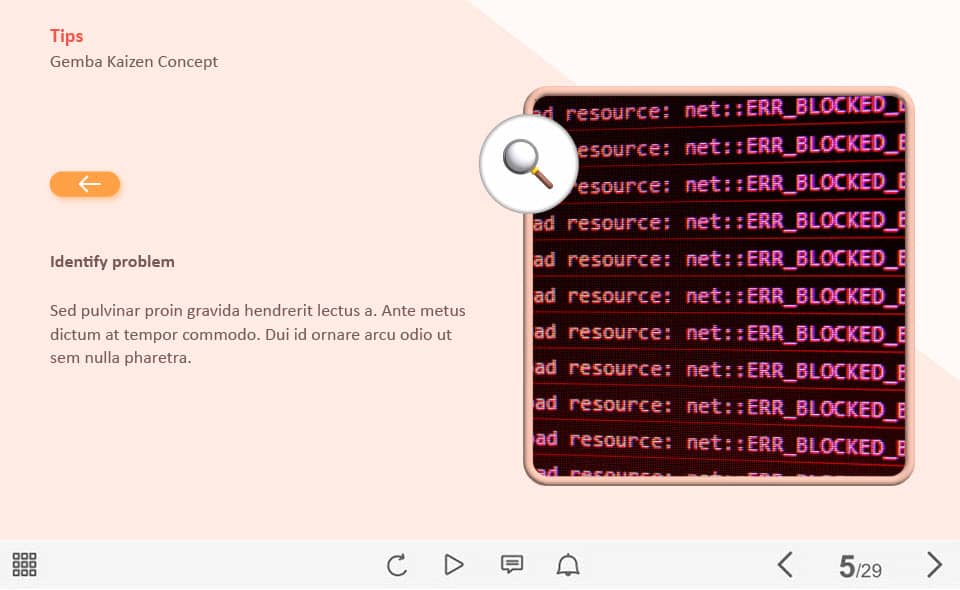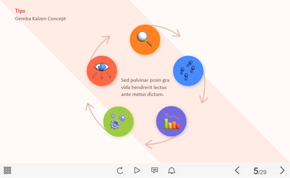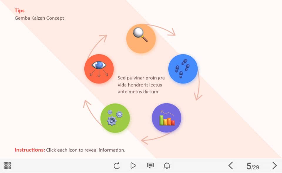 Gemba Kaizen Concept — Captivate Template. The unique eLearning interaction is designed with Captivate 2019 software. The template contains five clickable objects designed as coloured circles with icons. The user must click on each of them to reveal the additional information in pop-ups. The template is a ready-made product: all you need is to insert it into the projects and fill with own training content. It’s recommended to launch it on the devices with the screen size more than 7 inches.