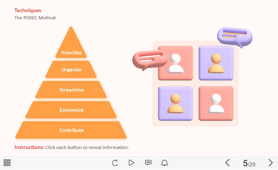 Benefits of Asking Why Habits — Captivate Template. The unique eLearning interaction is designed with Captivate 2019 software. The template represents a classic vertical slideshow that is composed of six slides. The user must click the down and up arrows to reveal the additional information. The template is a ready-made product: all you need is to insert it into the projects and fill with own training content. It’s recommended to launch it on the devices with the screen size more than 7 inches.