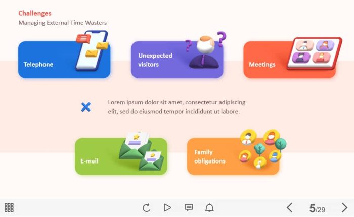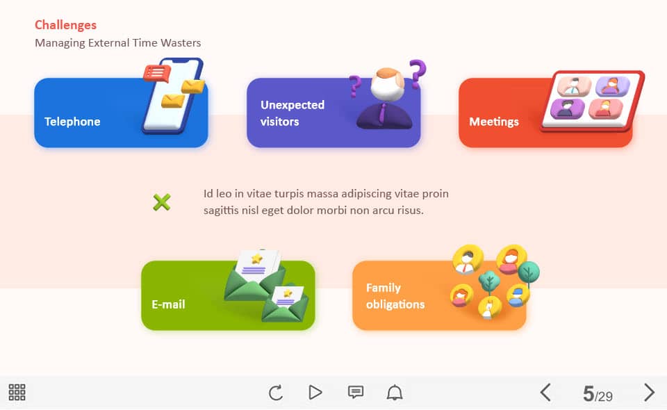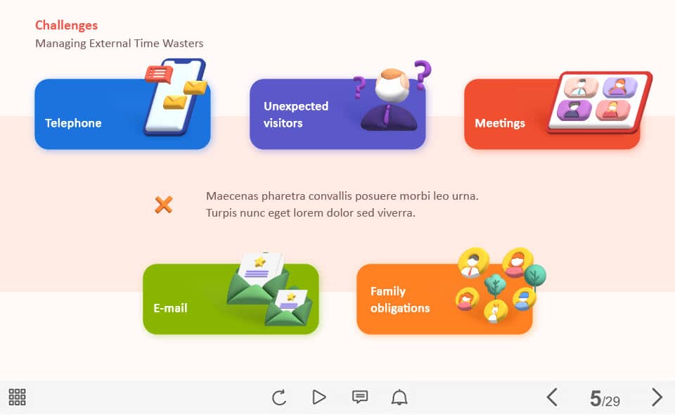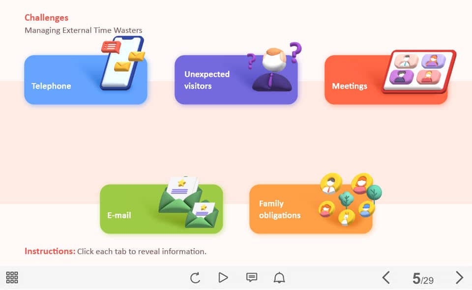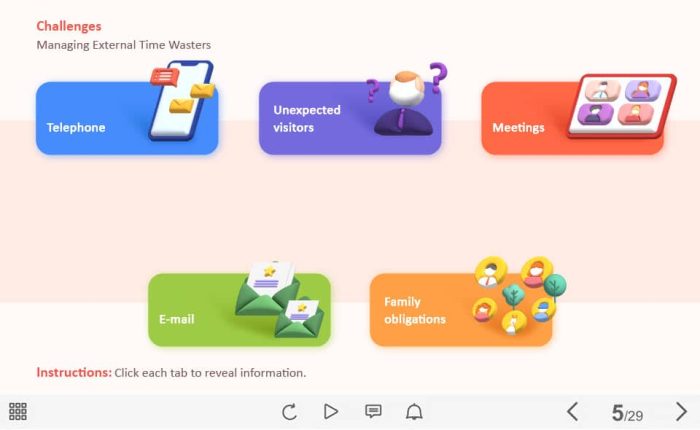 External Time Wasters — Captivate Template. The unique eLearning interaction is designed with Captivate 2019 software. The template contains five buttons designed as cards with icons. The user must click on each of them to reveal the additional information. The template is a ready-made product: all you need is to insert it into the projects and fill with own training content. It’s recommended to launch it on the devices with the screen size more than 7 inches.
