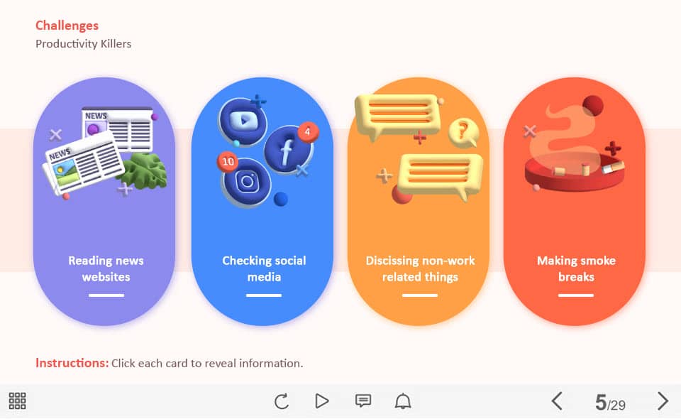 Productivity Killers — Captivate Template. The unique eLearning interaction is designed with Captivate 2019 software. The template contains four clickable objects designed in various colours. The user must click on each of them to reveal the additional information in pop-ups. The template is a ready-made product: all you need is to insert it into the projects and fill with own training content. It’s recommended to launch it on the devices with the screen size more than 7 inches.