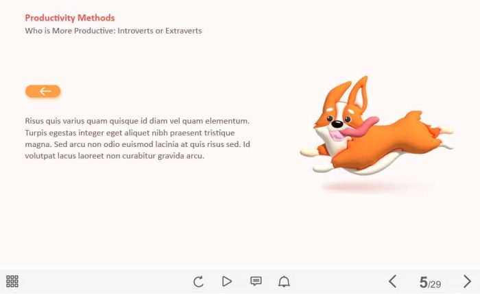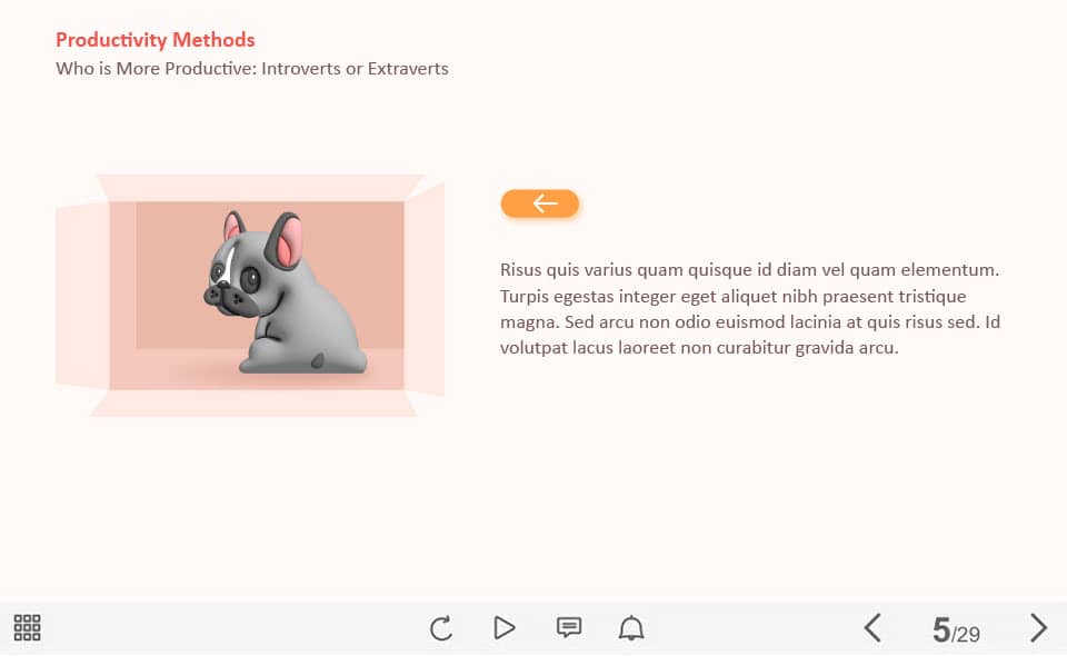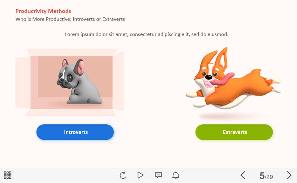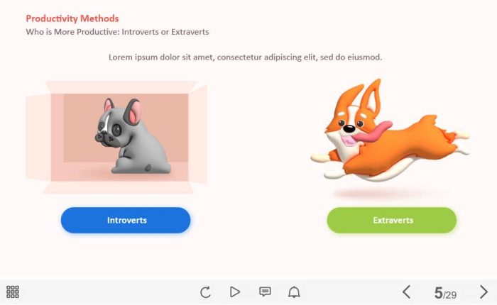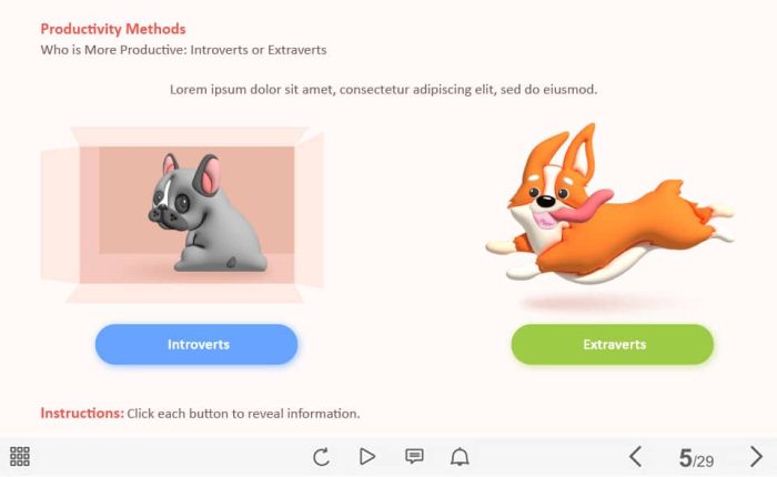 Introverts vs Extraverts — Captivate Template. The unique eLearning interaction is designed with Captivate 2019 software. The template contains two buttons that are illustrated with the pictures of dogs. The user must click on each button to reveal the additional information. The template is a ready-made product: all you need is to insert it into the projects and fill with own training content. It’s recommended to launch it on the devices with the screen size more than 7 inches.