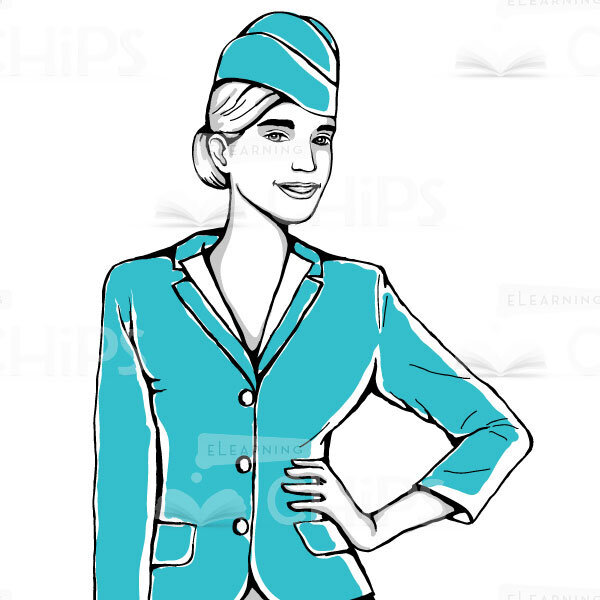 Vector image of a good-looking stewardess standing upright. Dressed in a stewardess uniform: white skirt, blue jacket and blue hat. Suitable for illustrating an air hostess in any web or print related project. This attractive character will surely help you to create your own elearning courses that will grab user’s attention.