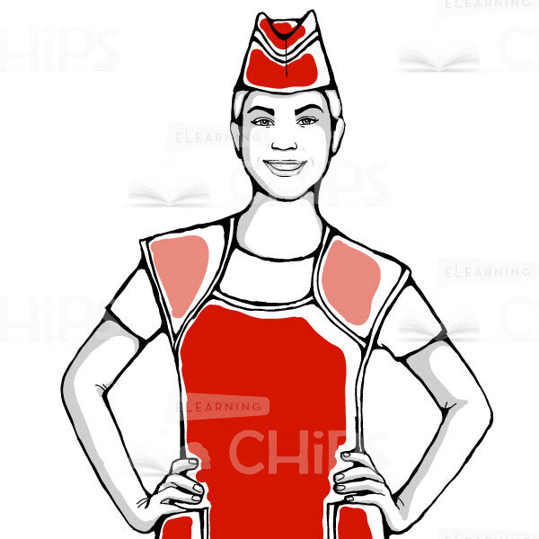 Vector image of a nice female shop assistant standing upright with hands on a waist. She is ready to help customers and answer any of their questions. Can be used to illustrate a sales assistant, cashier, saleswoman or any other supermarket employee. She can certainly be useful to you for creating an eye-catching elearning course or presentation that will surely grab learners’ attention.