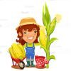 Pretty Female Farmer Grows Corn Vector Character. Dressed in a denim overall and green sweater. She is standing next to the growning maize and going to derail it. Excellent for use in web-design projects such as e-courses, presentations, advertisements, marketing, etc.