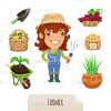 Pretty Female Farmer With Equipment Icons Vector Character. Dressed in a denim overall and green sweater. She is holding a rake in a left hand. There are also icons of gardeners tools such as wicker basket with fruit, grain bag, pot and gardening shovel. Excellent for use in web-design projects such as e-courses, presentations, advertisements, marketing, etc.