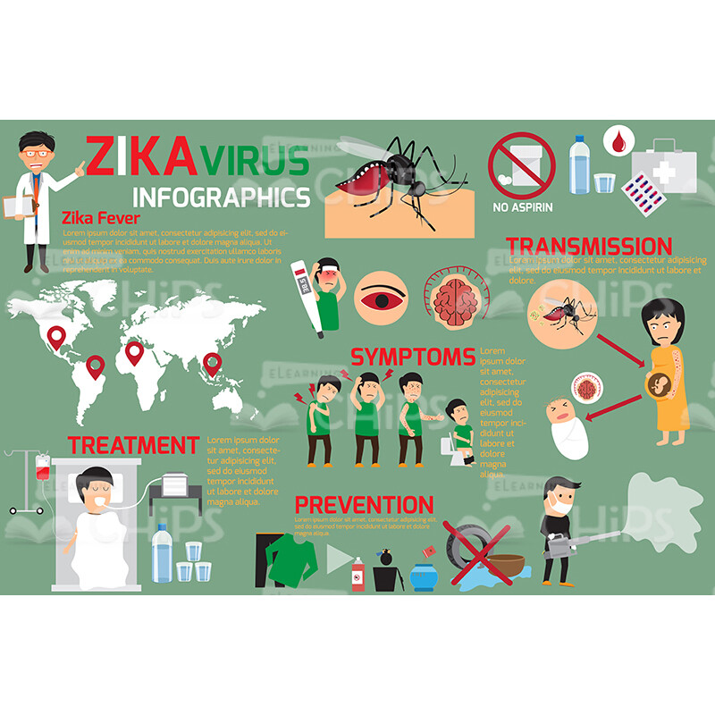 Zika Virus Vector Infographics. It is a perfect illustration of the struggle methods against a common disease. Would be a perfect addition for web and print related projects such as elearning courses, presentations and promotions. It is available in two formats: vector (.EPS) and raster (.PNG). Feel free to choose the right format that fully fits your needs. Keep in mind that it is possible to resize and modify the vector one according to your requirements.