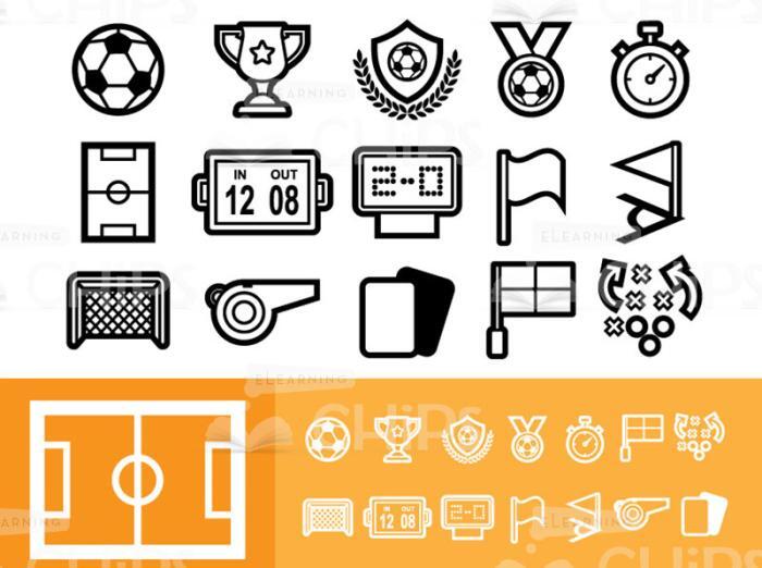 Football Icon Set. The group consist of various graphic objects connected with football / soccer playing. Add it to the course to make your project visually attractive. Download all-purpose Vector icons and create your own e-learning course. Change their color, size, orientation and insert directly into the project.