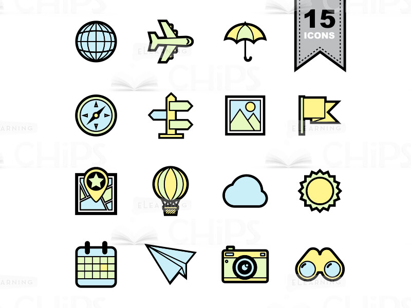 Vacation Icons Set. In this block you’ll find 15 coloured icons that will marvellously decorate your presentation. According to multi-purposed design could be used in numerous projects. Use this powerful vector icons and create your own e-learning courses.