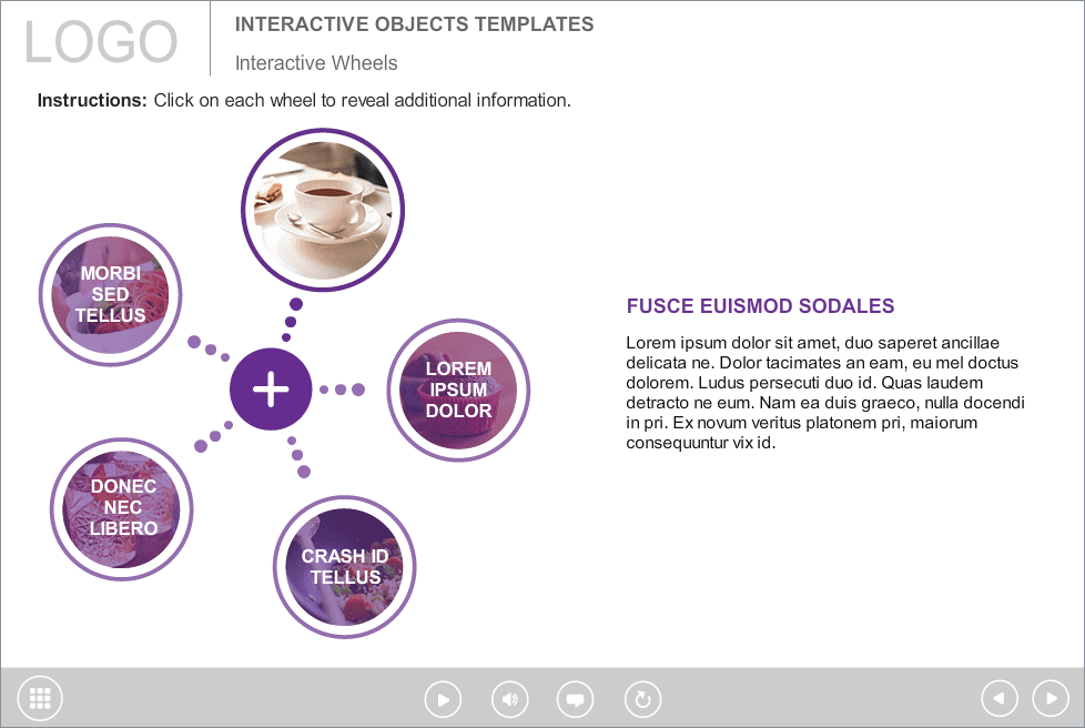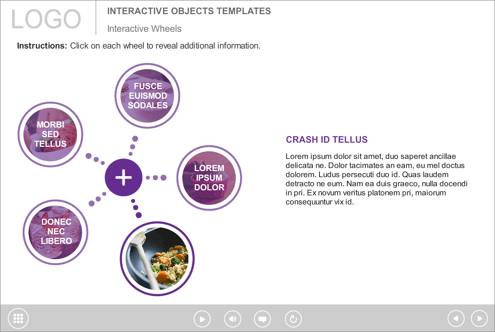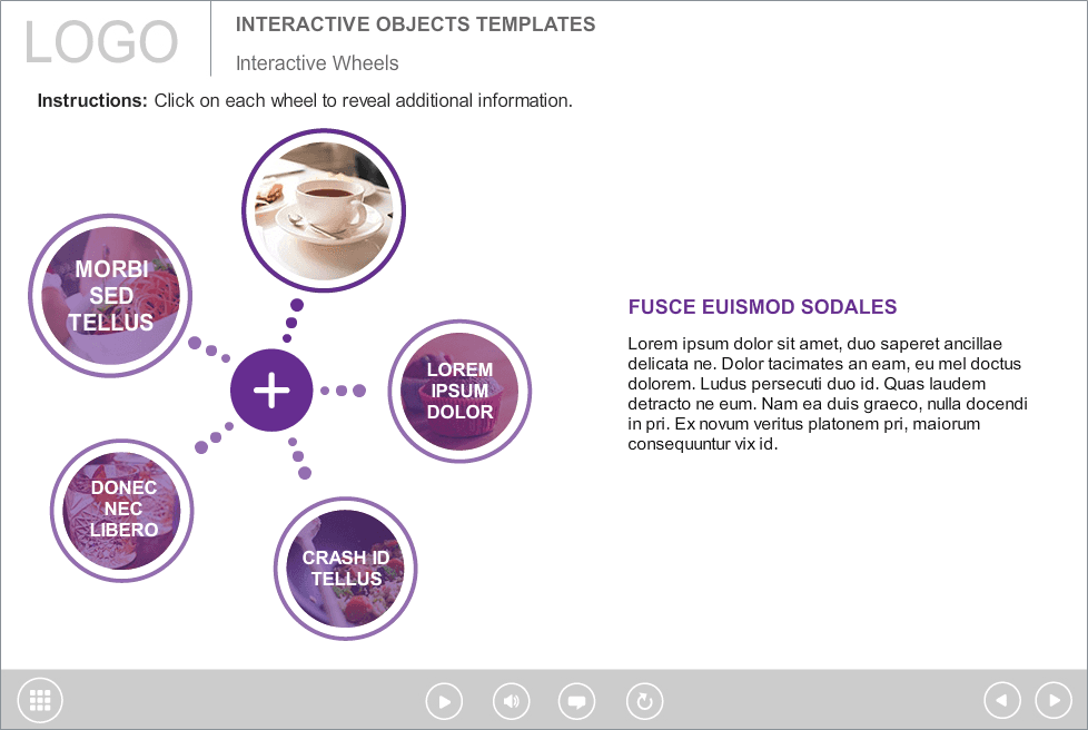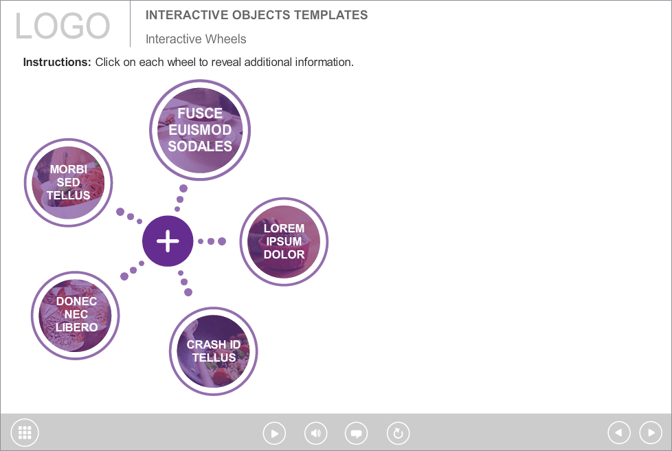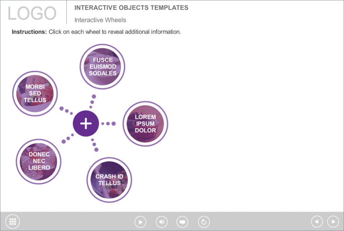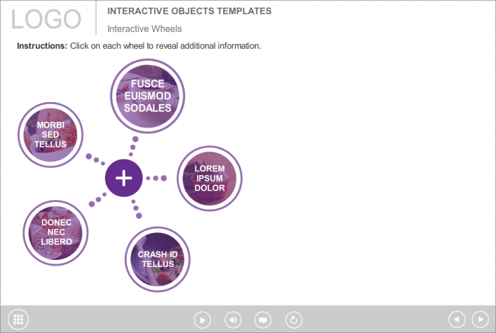Storyline Round Buttons Template. Storyline Template based on Articulate Storyline 2 Software. Designed for showing any type of information in tabs. Consist of 5 interactive buttons, intended to reveal additional info. Perfectly runs on both Tablet and PC. Could be easily added to any type of Articulate Storyline Player Skins to create an effective e-learning courses. It’s already designed and prepared for usage. Fully compatible with Articulate Storyline 3 and 360.
