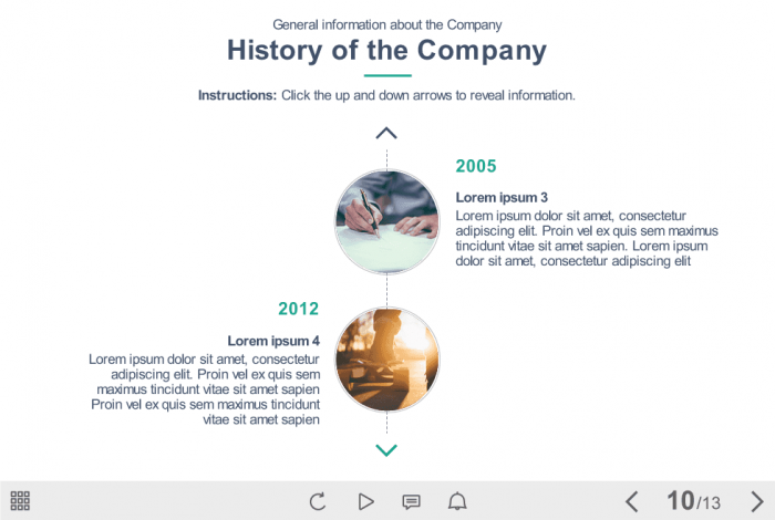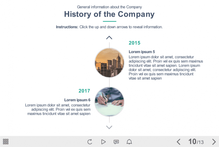Storyline Timeline Template. Designed in white colours, this Storyline Template would be a perfect choice to provide the training materials. It contains six events. The user must click on the up and down arrows to reveal the course information. The template is based on Articulate Storyline 2 software. It is possible to build it into any Storyline Course Template you need.