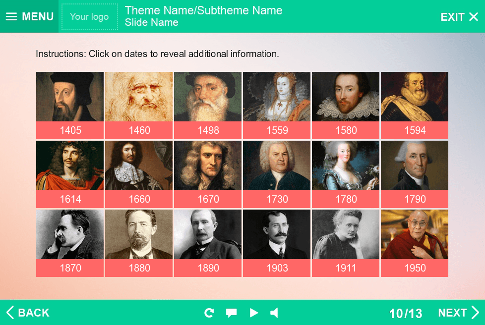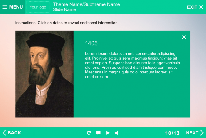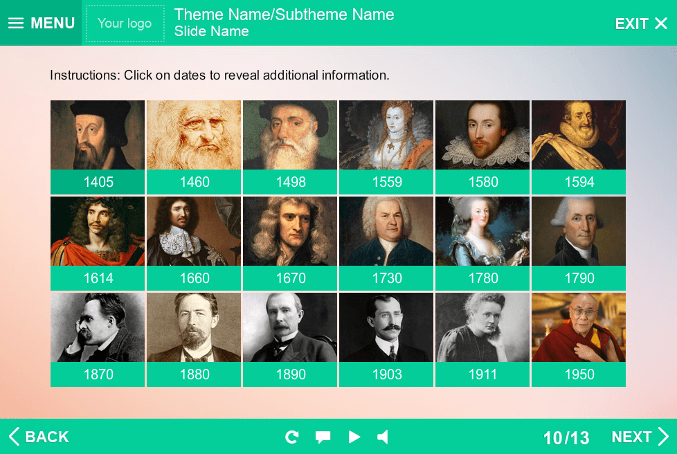Storyline Historic Persons Template. Storyline Template based on Articulate Storyline 2 Software. Designed for showing any type of information in special frames. Consist of 18 interactive grid cells, intended to reveal additional info. Perfectly runs on both Tablet and PC. Could be easily added to any type of Articulate Storyline Player Skins to create an effective e-learning courses. It’s already designed and prepared for usage. Fully compatible with Articulate Storyline 3 and 360.