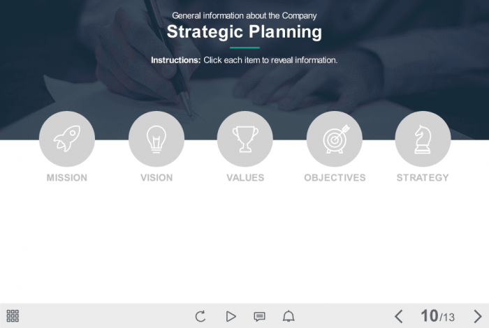 - Features: clickable visual objects designed for prudent use of slide space