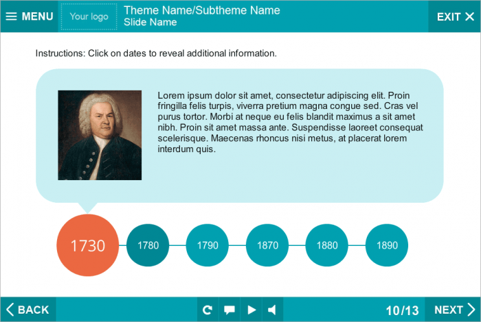 Storyline Timeline Template. Storyline Template based on Articulate Storyline 2 Software. Designed for showing any type of information in special frames. Consist of 6 interactive timeline buttons, intended to reveal additional info. Perfectly runs on both Tablet and PC. Could be easily added to any type of Articulate Storyline Player Skins to create an effective e-learning courses. It’s already designed and prepared for usage. Fully compatible with Articulate Storyline 3 and 360.