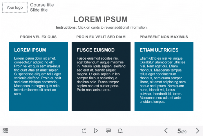 Three Flip Cards — Storyline Template. It contains 3 clickable pictures invented to reveal the additional information. The template is based on Articulate Storyline 2 software. It would be a great helper to create your own eLearning course. Perfectly runs on both PC and Tablet with screen larger than 7 inches. We’ve collected a huge variety of Storyline templates especially for elearning developers. Just browse through our templates library and pick any item(s) you need to create a fascinating visual story.