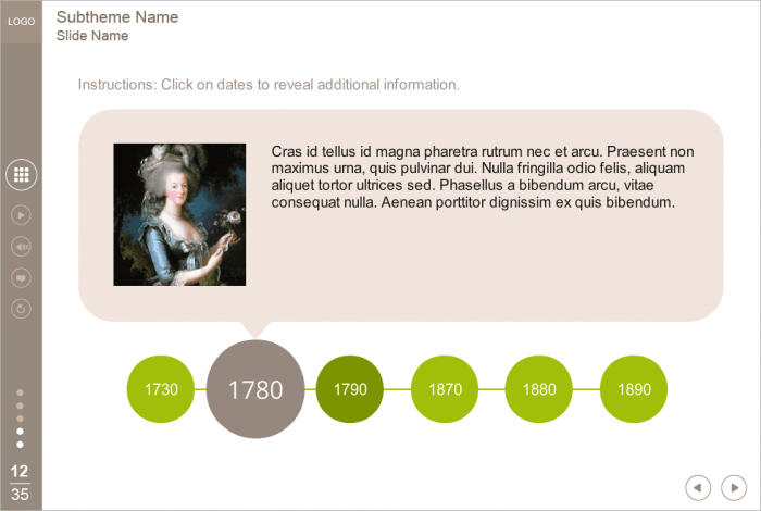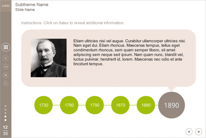 Storyline Momentous Years Template. Storyline Template based on Articulate Storyline 2 Software. It represents 6 clickable buttons, which display the additional information in special frame. This interaction is compatible with Articulate Storyline Player Skins. It can be used for creating your own effective e-course. Interactive slide is a ready-to-use product. Can be launched on PCs and tablets. Fully compatible with Articulate Storyline 3 and 360.