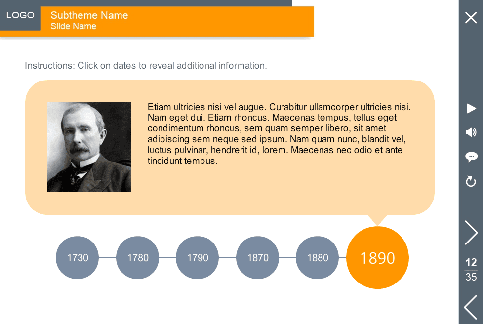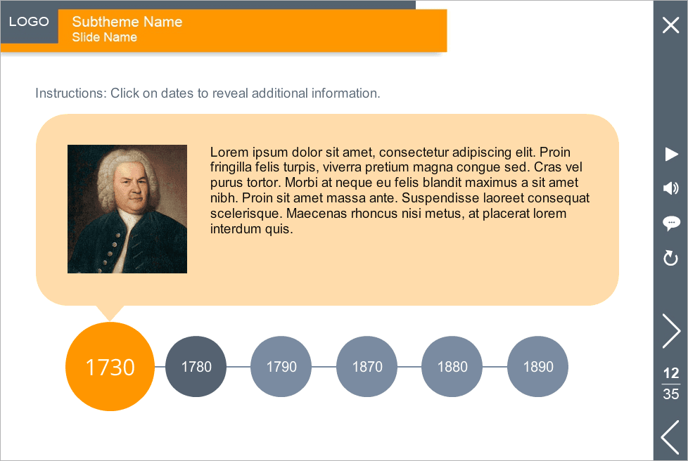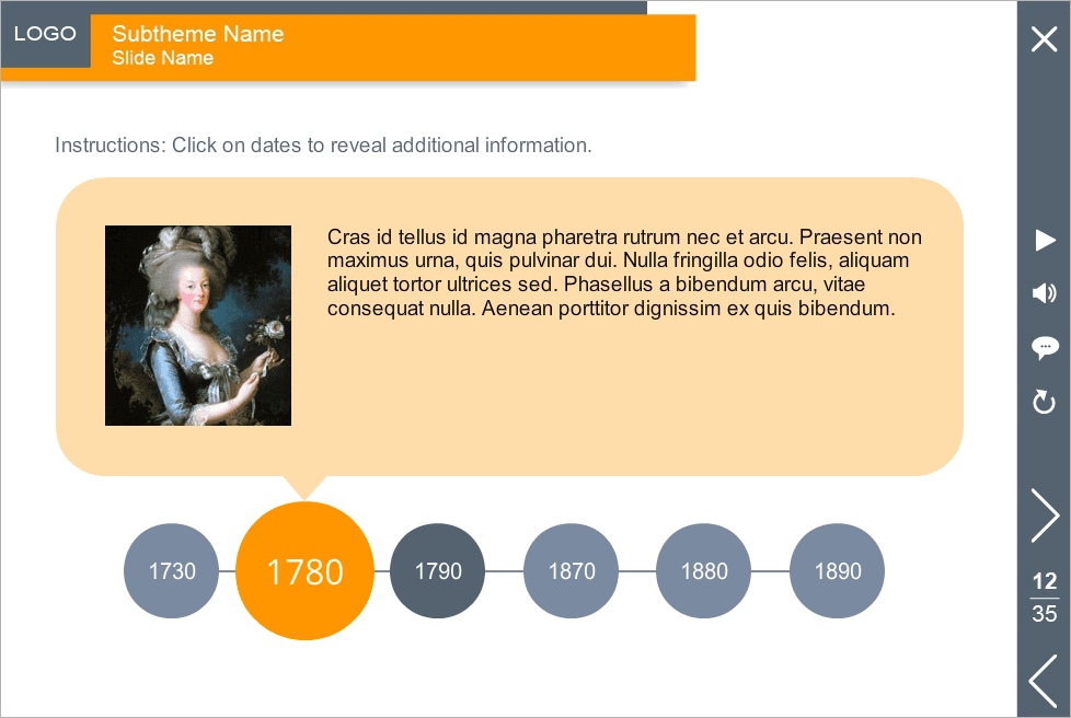 Storyline Important Years Template. Storyline Template based on Articulate Storyline 2 Software. It represents 6 clickable buttons, which display the additional information in special frame. This interaction is compatible with Articulate Storyline Player Skins. It can be used for creating your own effective e-course. Interactive slide is a ready-to-use product. Can be launched on PCs and tablets. Fully compatible with Articulate Storyline 3 and 360.