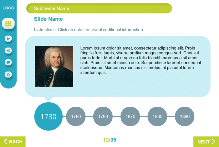 Storyline Timeline Template With Round Buttons. Storyline Template based on Articulate Storyline 2 Software and compatible with any Articulate Storyline Player Skin. Interactive slide contains 6 round buttons. Clicking on each of them leads to the showing the additional information in a central part of a screen. It can be used for creation of your own e-course. Perfectly runs on PC, tablet and mobile devices. Timeline interaction is already prepared for usage. Fully compatible with Articulate Storyline 3 and 360.
