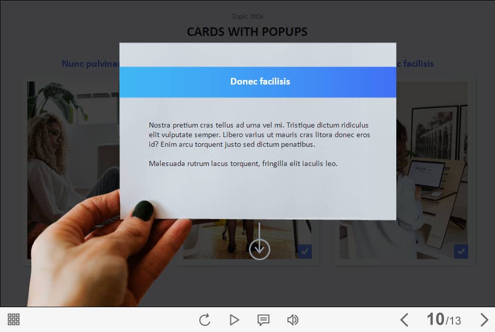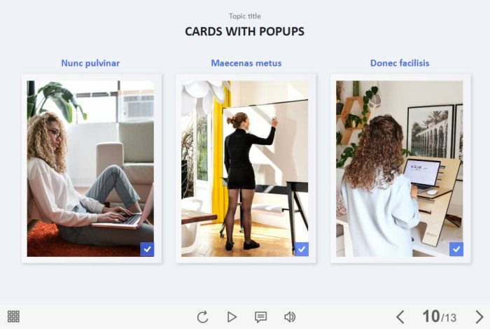 Three Clickable Cards — Storyline 360 Template. The eLearning interaction slide would become a great addition for your eCourse. It contains three clickable images. The user must click on each of them to reveal the additional information in pop-ups. The template is compatible with Storyline 360 software. All you need is just to paste the template into your project and to fill it with own learning materials. Try to create better courses with our amazing Articulate Storyline templates!